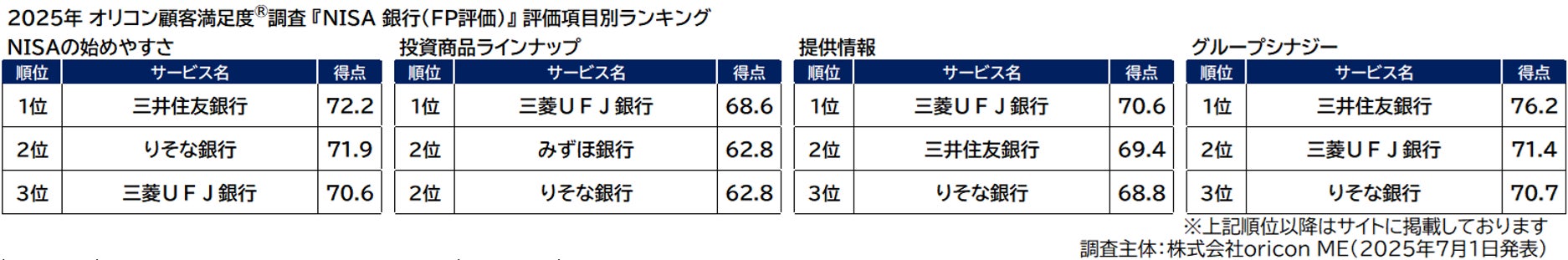 つづいて、総合2位の【三井住友銀行】は、評価項目別「NISAの始めやすさ」「グループシナジー」の2項目で1位に。