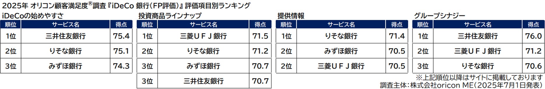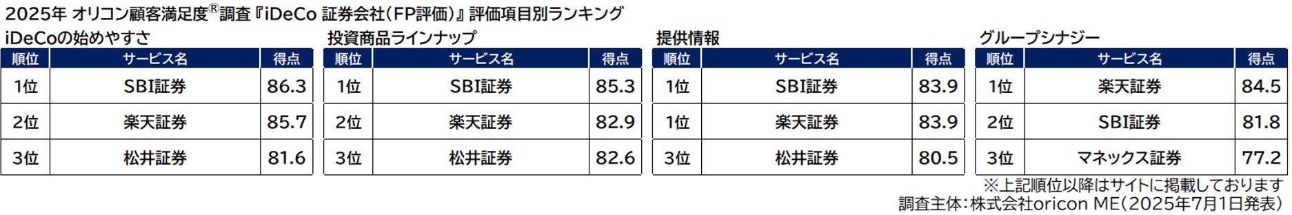 評価項目別では、「iDeCoの始めやすさ」「グループシナジー」の2項目で1位を獲得しました。