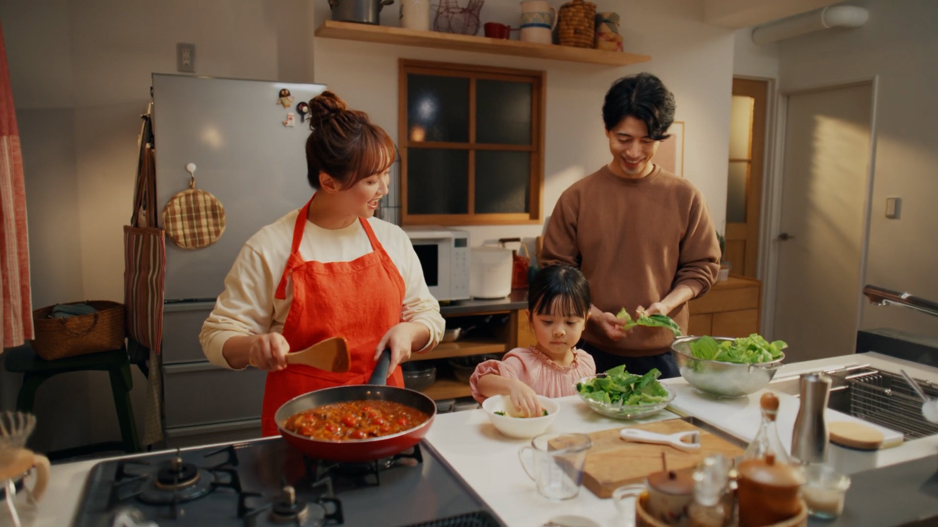新TVCMでは、「ハヤシの出番だ!」というメッセージとともに、子どもから大人まで楽しめる、完熟トマトのおいしさにこだわった「完熟トマトのハヤシライスソース」が、日々忙しい子育て世帯の心強いお助けメニューである様子を描きます。