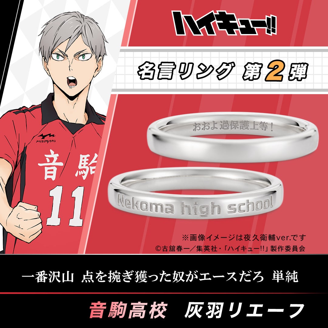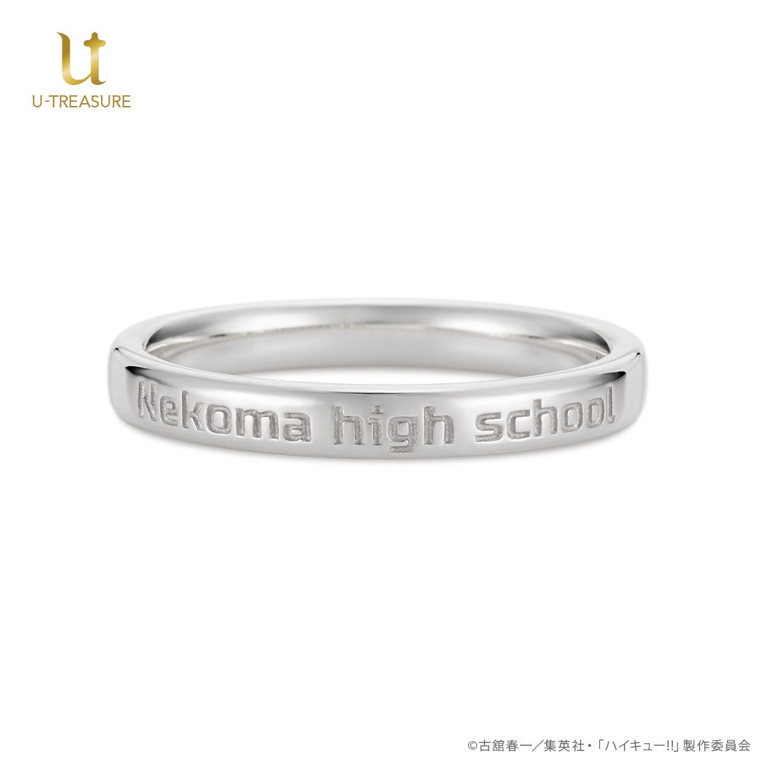 『音駒高校(Nekoma high school)』の校名をデザインしたリングの内側に、印象的なエピソードがよみがえる各キャラクターの名言を刻みました。