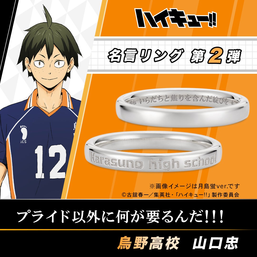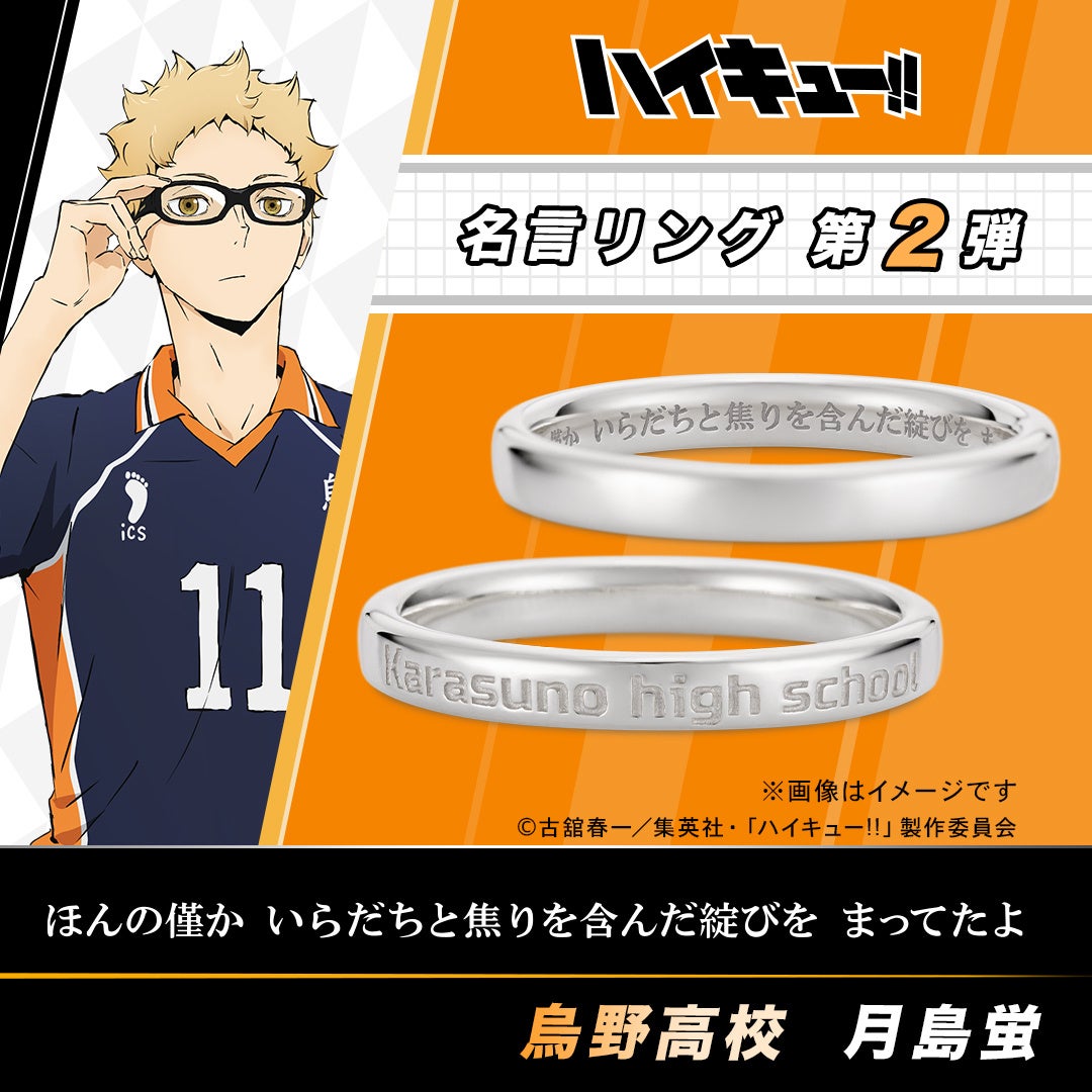 アニメ『ハイキュー‼』名言リング 第二弾(4種類)月島の「ほんの僅か いらだちと焦りを含んだ綻びを まってたよ」など、各キャラクターの名言を内側に刻印しました。2024年5月15日(水)まで予約受付