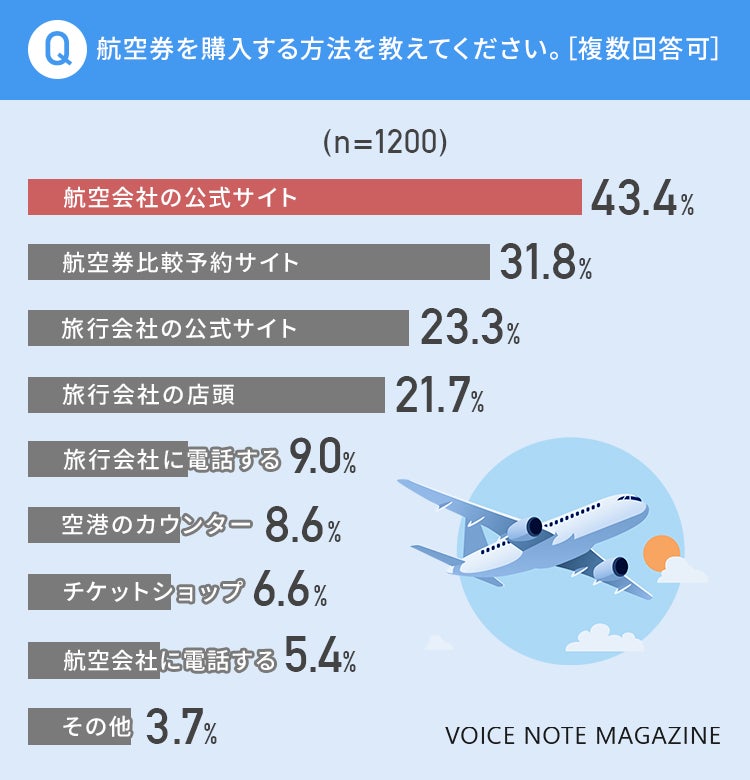 今回は、事前調査で「飛行機に乗ったことがある」と回答したボイスノート会員1,200名を対象に、「航空券予約」についてアンケート調査を実施しました。
