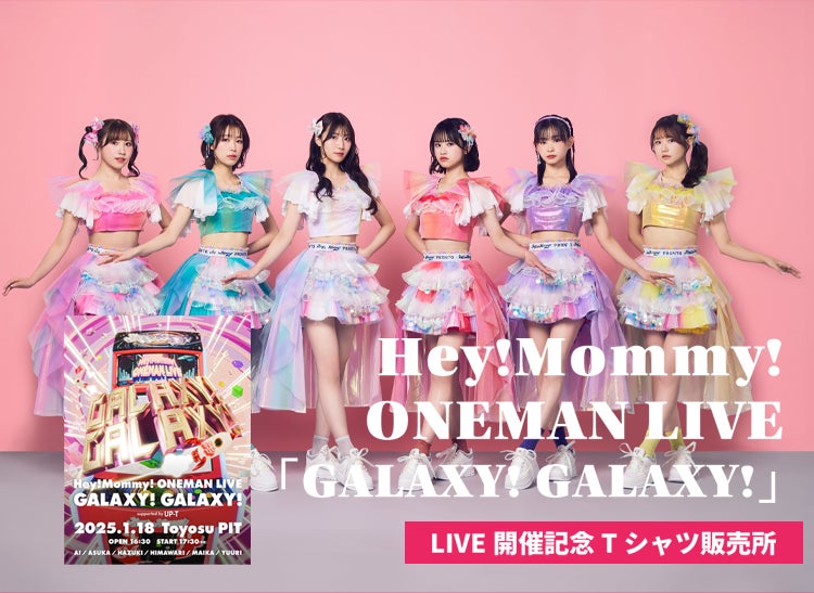 1月18日(土)に豊洲PITで行われた『Hey!Mommy! ONEMAN LIVE「GALAXY! GALAXY!」supported by UP-T』の開催を記念してUP-Tコラボショップをオープンします!コラボショップではLIVE当日に撮影した各メンバー事の写真をTシャツに印刷して販売いたします。ライブの盛り上がりをそのままTシャツにして皆さんにお届けします。