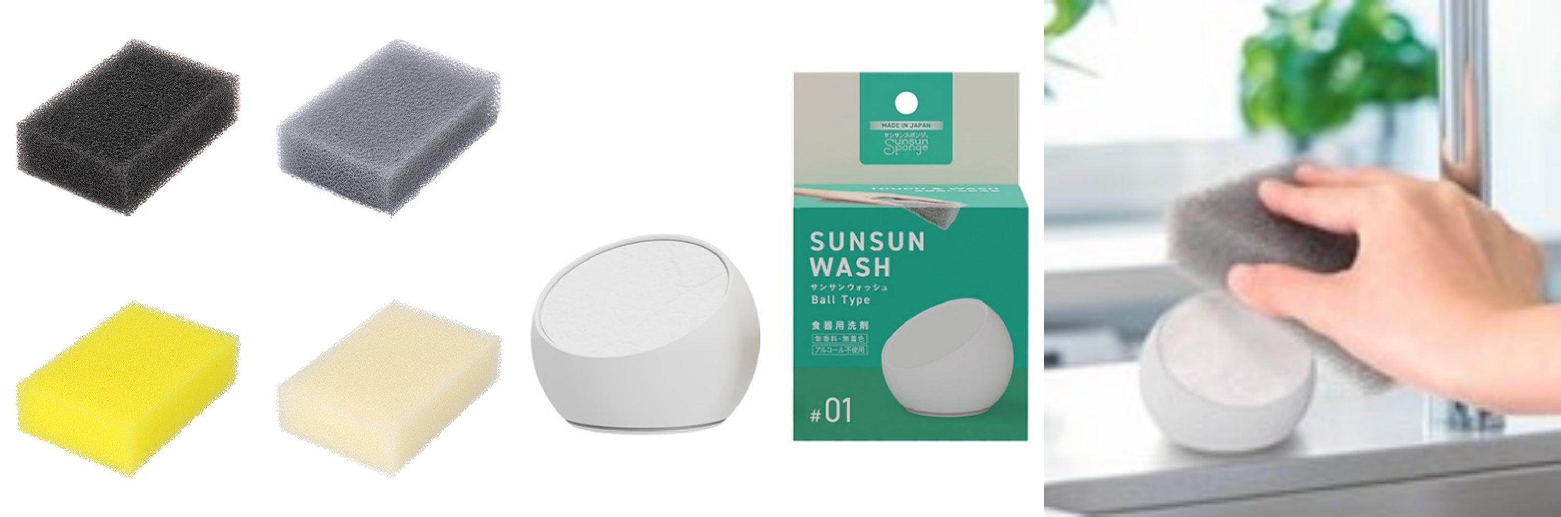 スポンジは驚くほど長持ちし、高品質ポリウレタンが洗剤のポテンシャルを最大限に引き出し、しつこい油汚れなどもスッキリ落とします。また珍しい固形洗剤であるサンサンウォッシュは、少量でよく泡立つので軽くタッチするだけで高い洗浄力を発揮します。