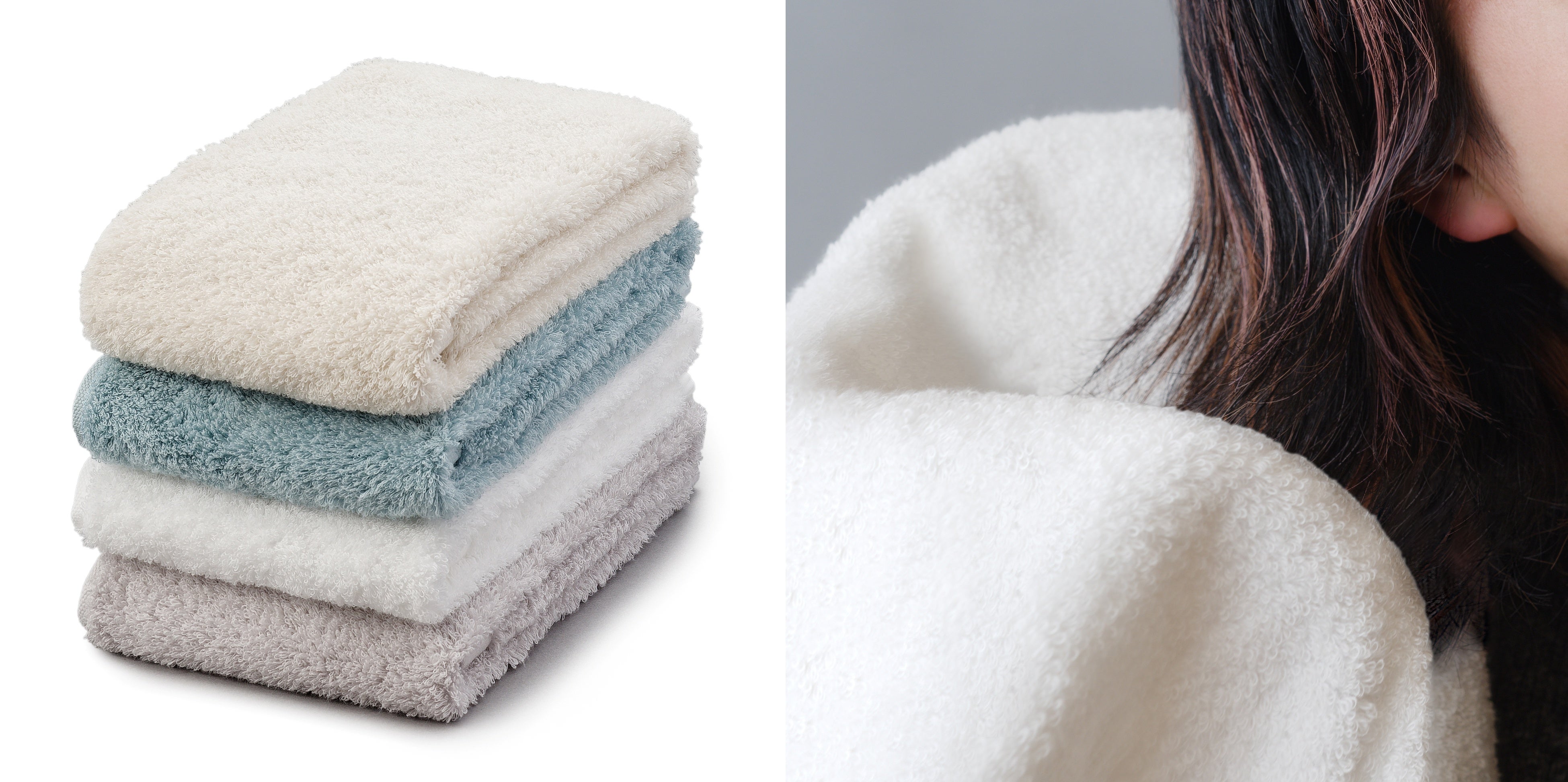 厳選された綿とレーヨンの特殊紡績糸である「エンジェルパフANGELPUFF®」を使用したタオル。綿より摩擦の少ないレーヨンが使用されているためなめらかな肌ざわり。ストローのように中心が空洞となった中空糸を使用し、タオルがふんわり軽くなり、吸水速度も速くなりました。お肌や髪に負担が少なく、やさしく拭くことができるこだわりのアイテムです。