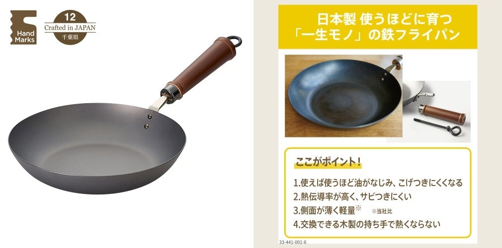 鉄に窒化処理を施すことで、鉄の弱点であるサビを極めて抑えた鉄フライパン。面倒な「空焼き」が不要で、使えば使うほど油が馴染み、焦げ付きにくく育ちます。熱伝導率が高く、お肉はジューシーに、野菜炒めはシャキッと仕上がるのは鉄ならでは。側面を薄くした軽量設計※当社比で扱いやすく、交換可能な木製ハンドルは熱くなりませ。