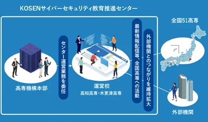 これまで高専の行ってきたサイバーセキュリティ教育をさらに高度化し、以下の取り組みを中心に、これからのサイバー空間とフィジカル空間が融合した社会に求められる人材の育成に貢献するため、高専機構本部にKOSENサイバーセキュリティ教育推進センターが設置され、木更津高専と高知高専が運営校となっています。