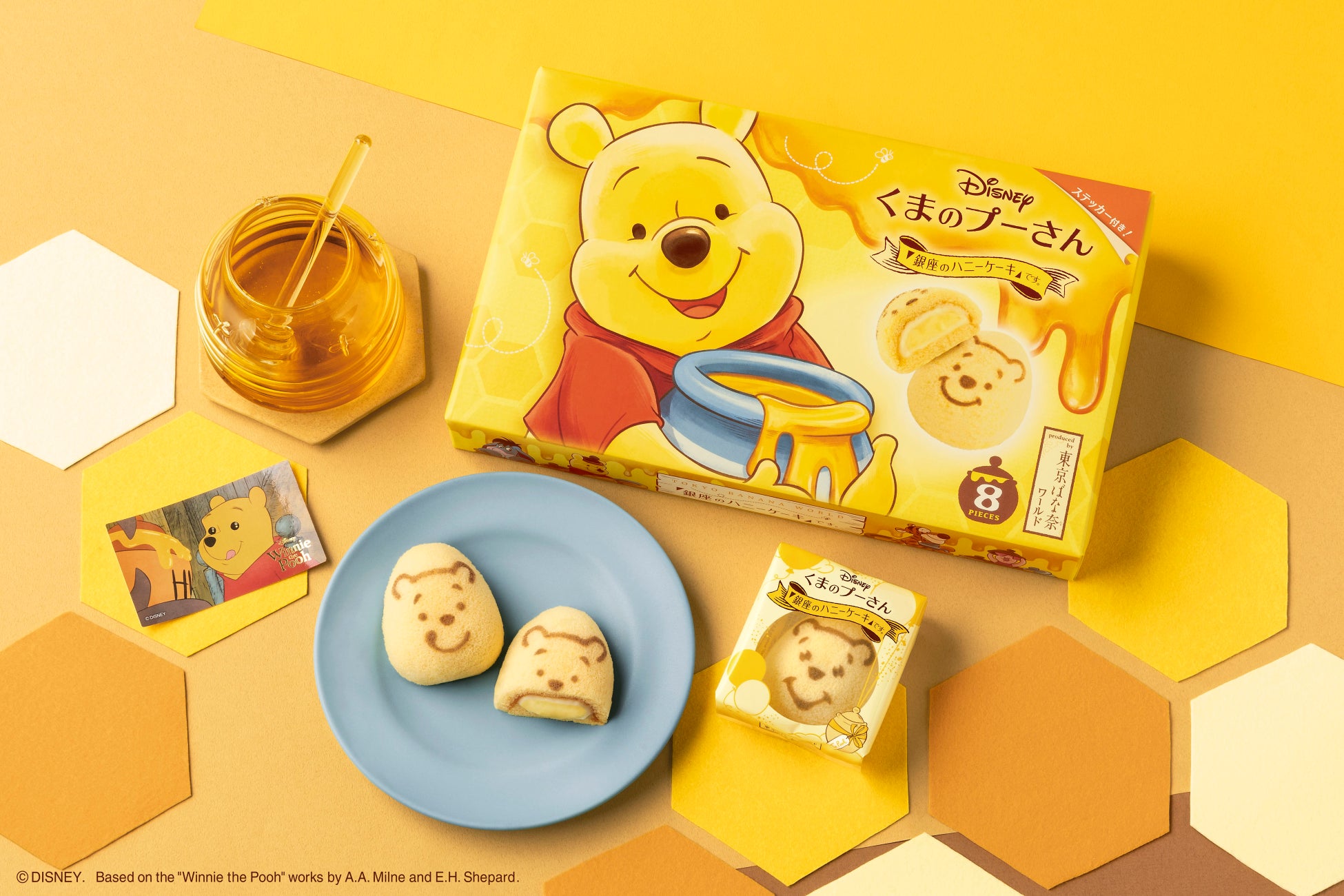 改札内B1「スクエア ゼロ」にて販売する『くまのプーさん/「銀座のハニーケーキ」です。』(8個入 1,728円)は、表情豊かな「プーさん」にときめく、ダブルクリーム仕⽴てのスポンジケーキです。中には、「プーさん」が⼤好きなはちみつ⾹るカスタードクリームとなめらかなミルククリームがとろ〜り。かわいいオリジナルステッカー付きです。