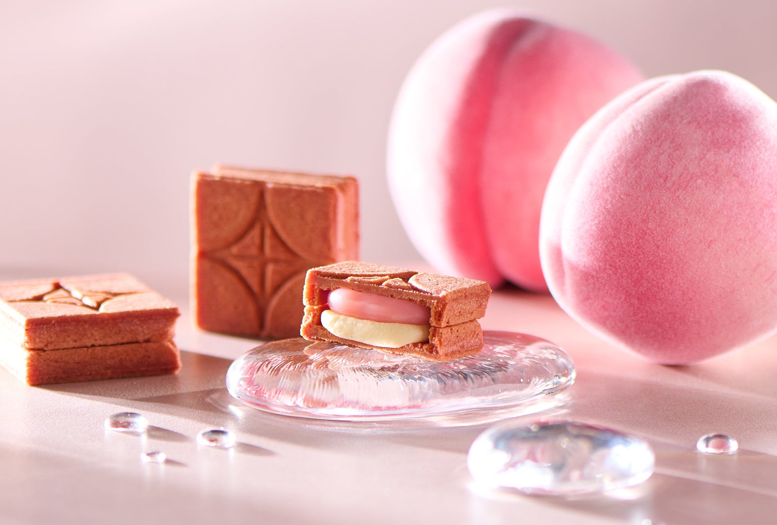 期間限定で登場する「バターサンド〈桃〉」(5個入 1,404円)は、濃厚で甘酸っぱい桃ガナッシュと桃ジャムを練り込んだ桃バタークリームをサクサクのクッキーで挟みました。かじると2層の美味しさがとろりとあふれだし、桃そのものを食べているような味わいが口いっぱいに広がります。