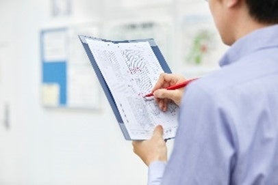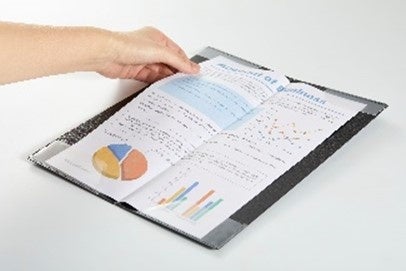 「ハードホルダー ホッソ」は上下のフラップに書類を固定することでファイルに入れたまま書き込めるほか、表紙が丈夫なので立ったままの筆記も可能です。