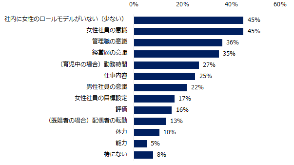 3:女性活躍推進における課題、「ロールモデル不足」「女性社員の意識」が同率1位。(図4)