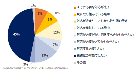 2022年4月より、従業員101名以上の企業に「女性活躍を推進するための行動計画策定及び情報公表」が義務化されました。このような女性活躍推進法に関する各種義務化について、対応状況を伺うと「すでに必要な対応が完了」と回答した企業は8%でした。