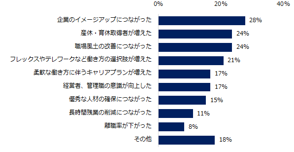 「すでに必要な対応が完了」「現在取り組んでる最中」と回答した企業に、取り組んだことで良かったことを伺うと、上位は「企業のイメージアップにつながった」(28%)、「産休・育休取得者が増えた」「職場風土の改善につながった」(同率24%)でした。その他と回答した企業は、「現在取り組んでいる最中なのでまだわからない」という回答が大半でした。