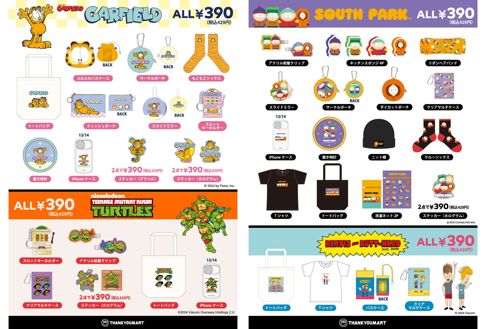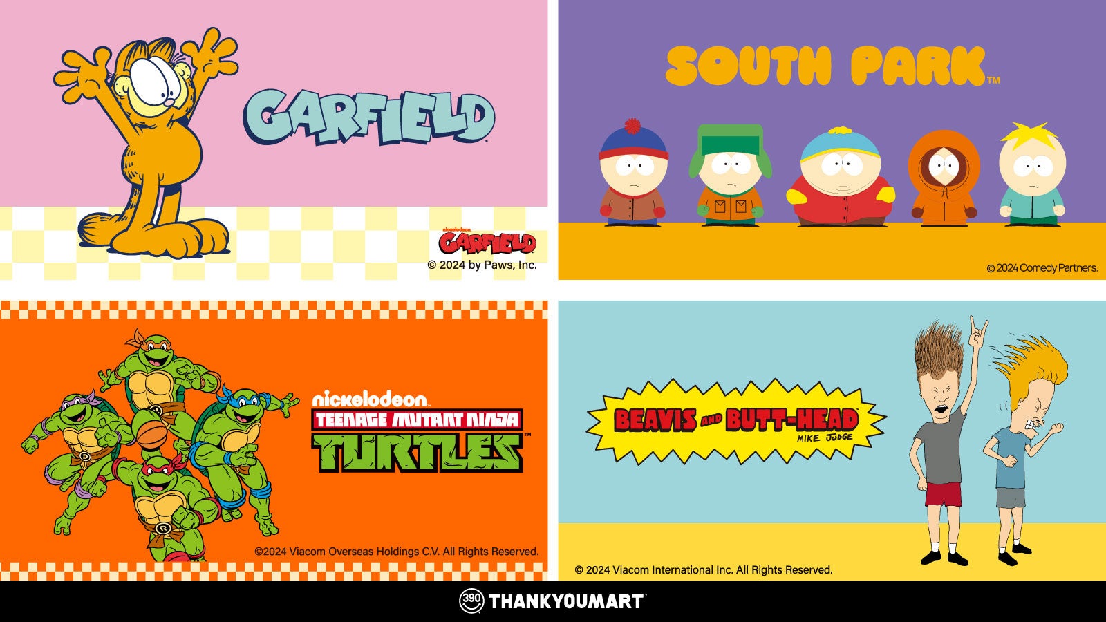 「ガーフィールド」「ミュータント タートルズ」「ビーバス・アンド・バットヘッド」「サウスパーク」の大人気4作品がサンキューマートに登場します。