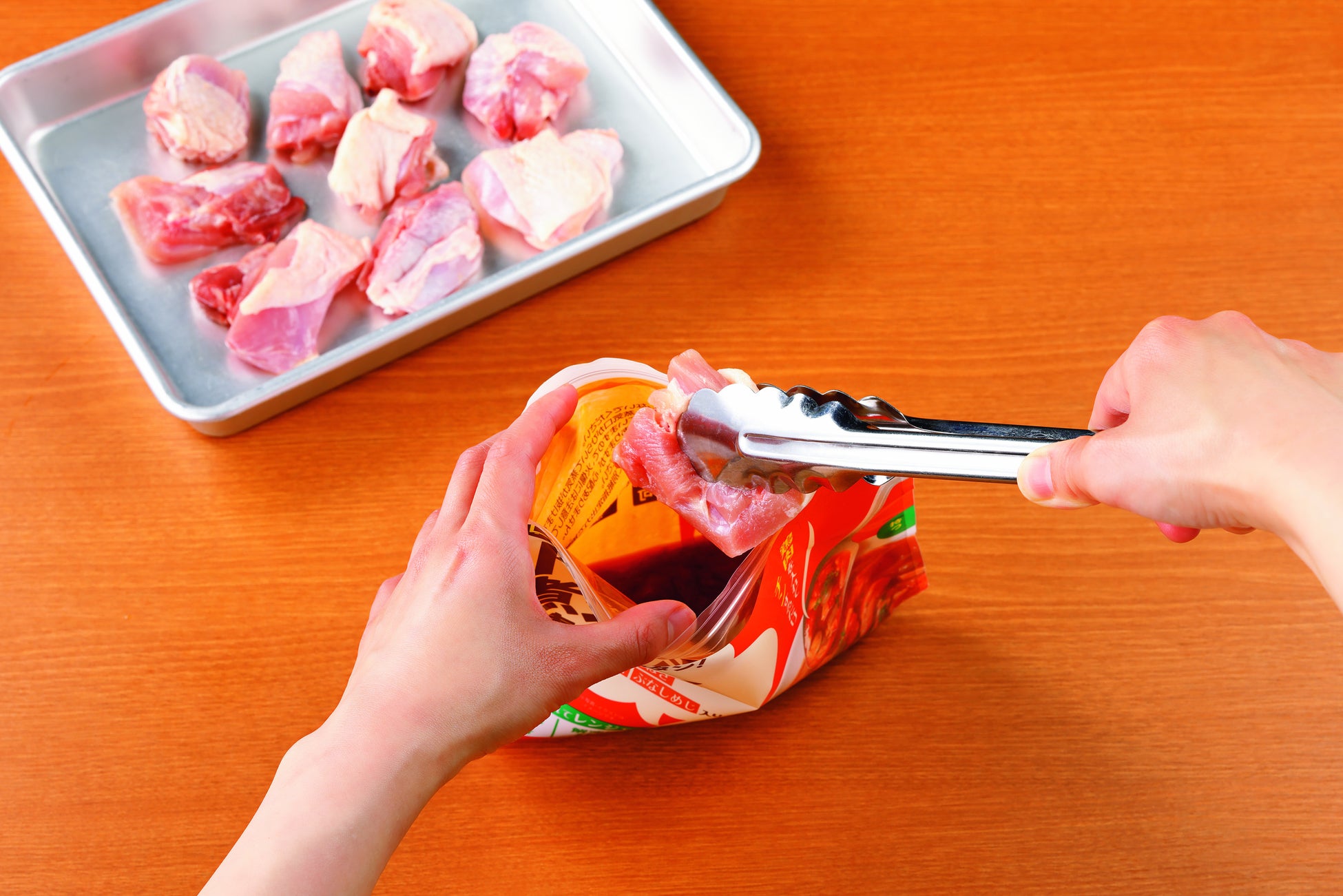 ・袋上部の「あけくち」を切り、中に鶏肉を入れる