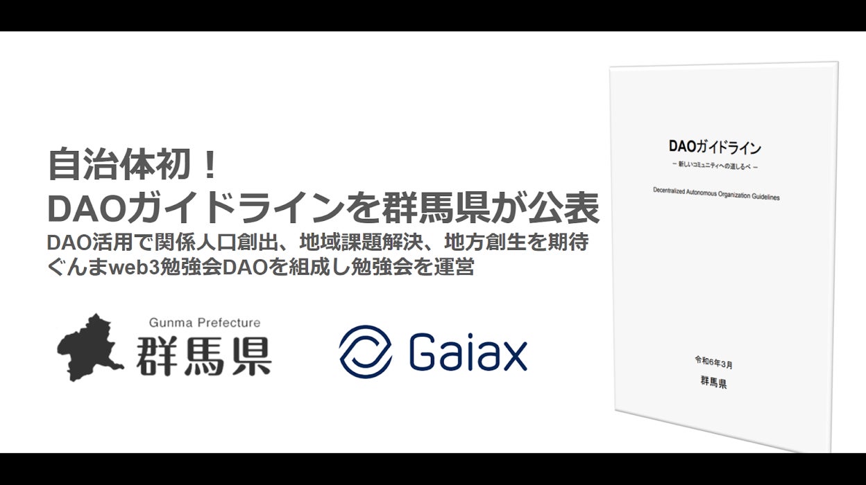 株式会社ガイアックス(本社:東京都千代田区、代表執行役社長:上田 祐司、証券コード:3775、以下 ガイアックス)は、群馬県から受託した「DAOガイドライン - 新しいコミュニティへの道しるべ -」( https://www.pref.gunma.jp/uploaded/attachment/622240.pdf )が公開されたことをお知らせします。