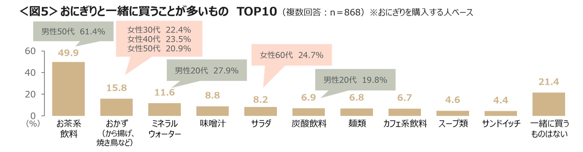 男性20代は「ミネラルウォーター」「炭酸飲料」、男性50代は「お茶系飲料」といった飲料、女性30~50代は「おかず」、女性60代は「サラダ」と一緒に購入していることが多い。<図5>