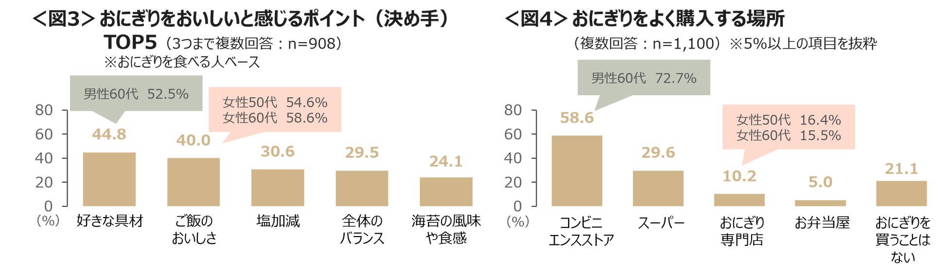 男性60代では「好きな具材」、女性50~60代では「ご飯のおいしさ」が決め手になっている。<図3>