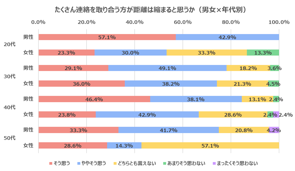 続いて、たくさん連絡を取り合う方が距離は縮まると思うかどうか聞いてみました。こちらも年代別と男女別でまとめたところ、20代男性は「そう思う」「ややそう思う」と回答した人が全員という結果になり、女性の約2倍となりました。男性の方はどの年代においても、たくさん連絡を取り合う方が距離は縮まると考えているようです。