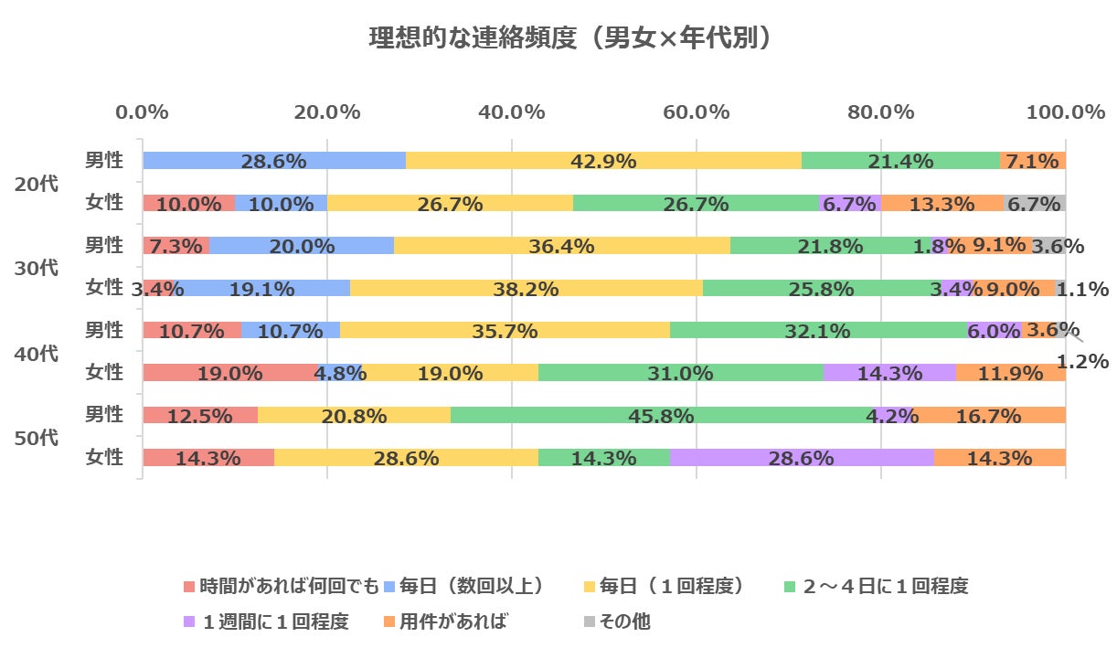 30代は男女ともに理想頻度に大きな差はありませんが、20代と40代は男性の方が、50代は女性の方が理想的な連絡の頻度の回数が多い結果となりました。