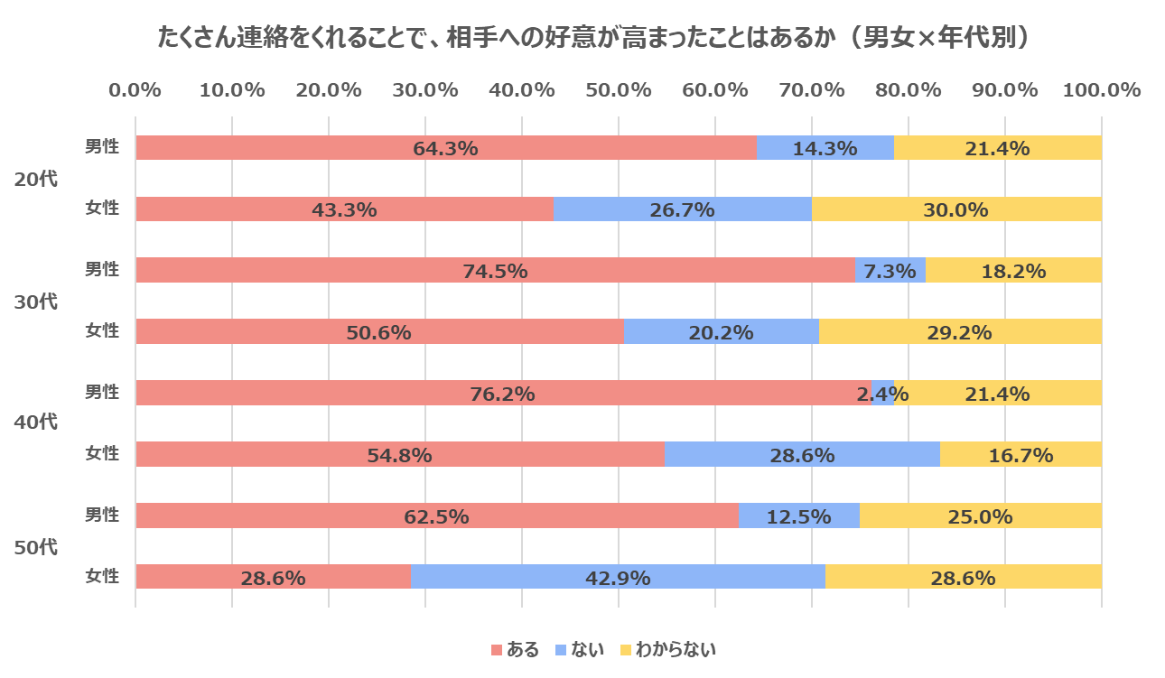 最後に、たくさん連絡をくれることで、相手への好意が高まったことはあるかどうか聞いてみました。どの年代おいても男性の方が、好意が高まったことがあると回答しています。しかし女性においては男性ほど好意が高まることはないようです。良かれと思って送った内容が場合によっては逆効果になっている可能性があるかもしれません。