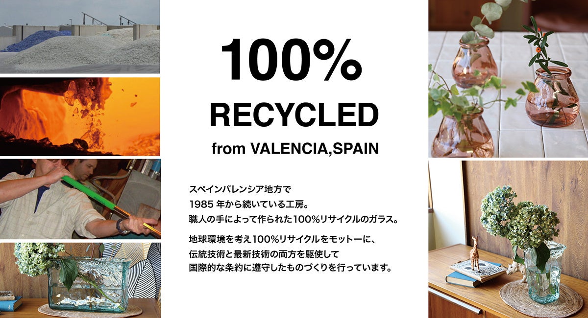 スペインバレンシア地方で1985年から続いている工房で職人の手によって作られた、100%リサイクルガラスのフラワーベースです。工房では地球環境を考え、100%リサイクルをモットーにものづくりを行っています。