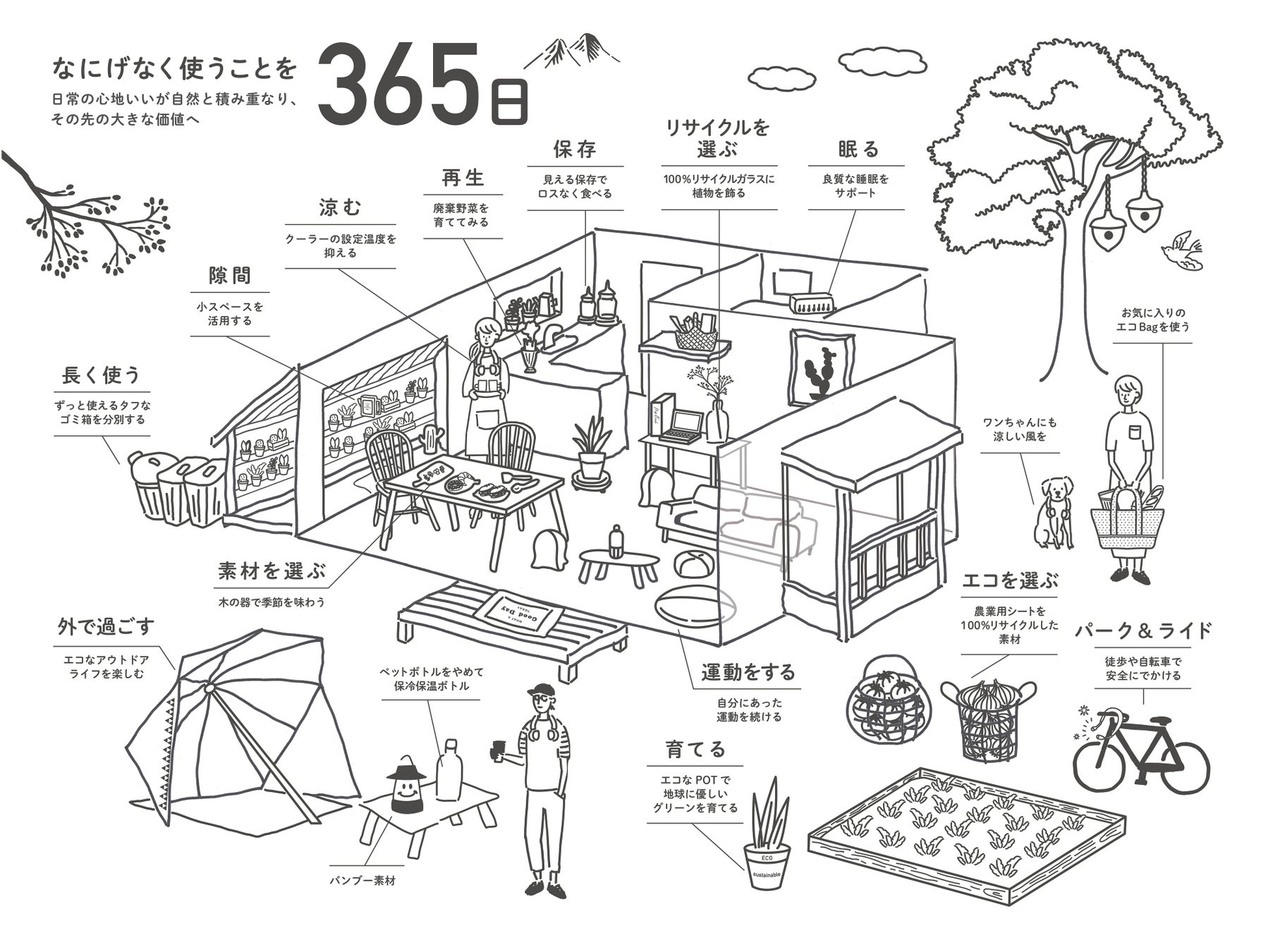 当社は「なにげなく使うことを365日」 をテーマに、廃棄野菜を育てるための花器「リボベジガラス」や、建築に使われない天然木曽ヒノキの枝や端材から生まれた「ヒノキ 天然消臭除菌スプレー」など毎日の生活中で取り入れやすい、おしゃれで便利なサスティナブルグッズを販売いたします。