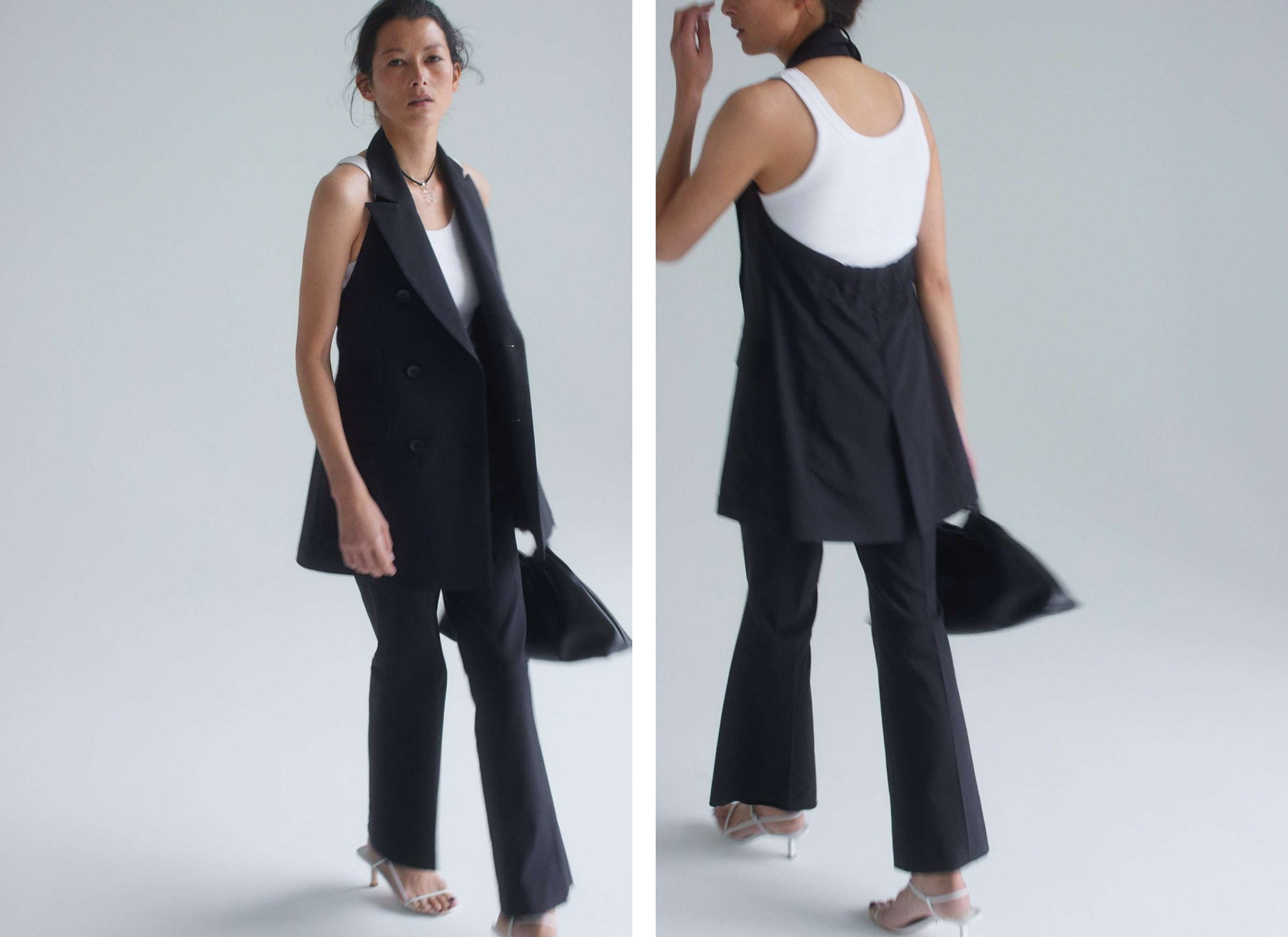 「ジレとパンツ。全く新しいセットアップ。「きちんと着る」というよりは、自分らしくいる――という感じ。Tシャツ、タートルニット。季節によって合わせるインナーを替えられるのも、今っぽい。夏は少し「肌感」を生かして。」