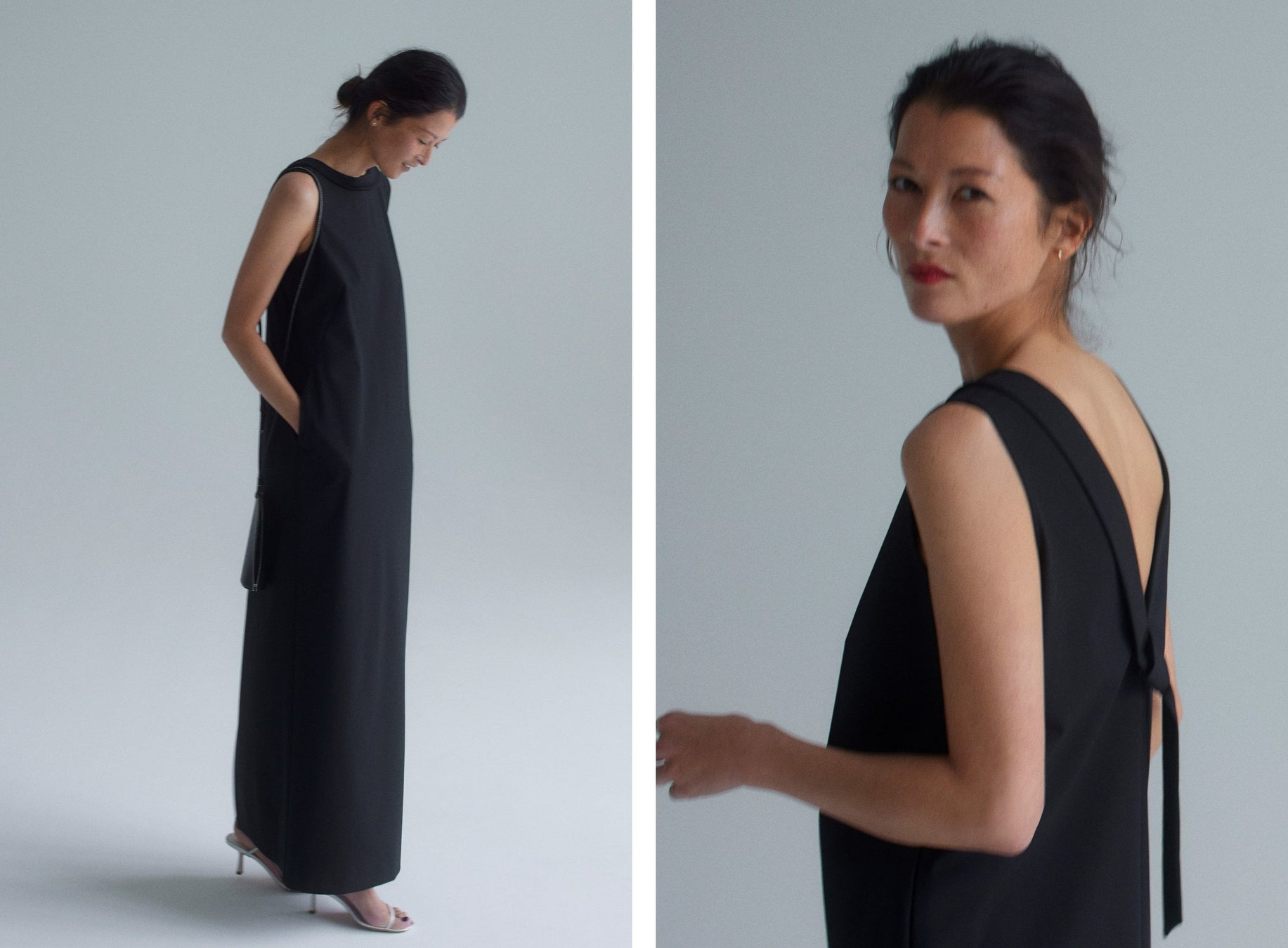 「Vのエッジが縁取る背中の艶やかさが、最強、唯一のアクセサリー。肌=光と黒=影を、大胆に切り取ったドレスには、合わせる情報は不要です。時間軸やふさわしいシーンは、合わせる靴によって変化するから、フラット、ハイヒール、TPOによって選びたい。」