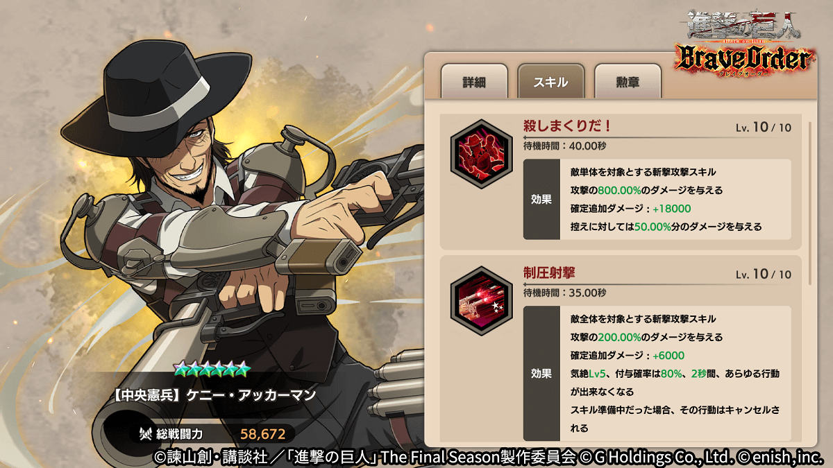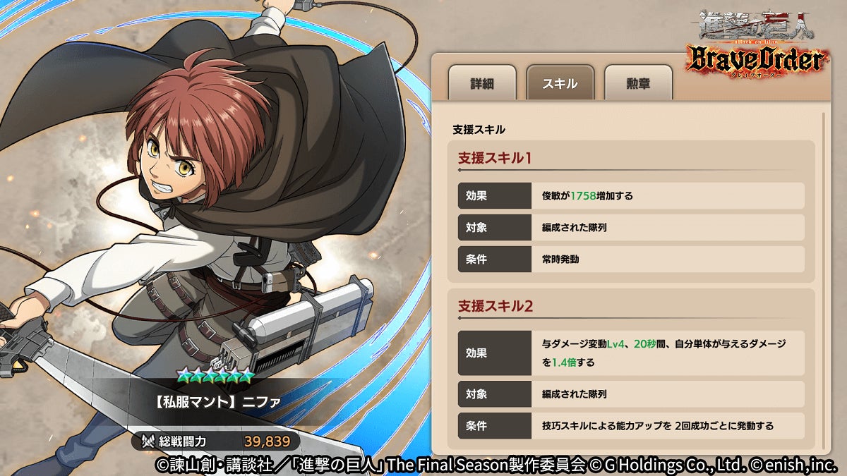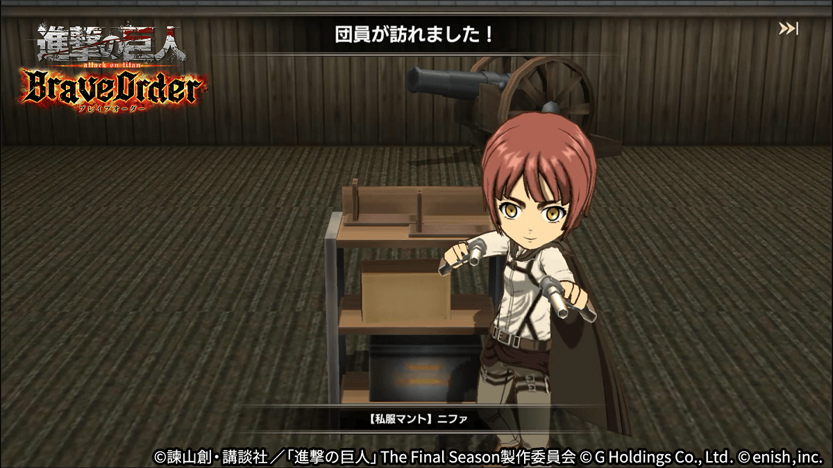 株式会社enish(本社:東京都港区、代表取締役社長:安徳 孝平、以下enish)は、アニメ『進撃の巨人』のスマートフォンゲーム最新作「進撃の巨人Brave Order」にて、8月30日(火)より新イベント「真の王と中央憲兵」を開催!ケニーの帽子を集めてイベント限定の「おもてなし・模様替えアイテム」を手に入れよう!また、本日より新登場の【中央憲兵】ケニー・アッカーマン、【継承の儀式】ヒストリア・レイス、【私服マント】ニファがピックアップされた「真の王と中央憲兵ガチャ」も同時開催!その他、最新情報はゲーム公式サイト・ゲーム公式Twitterアカウントにて随時公開して行きますので、ぜひご覧ください。