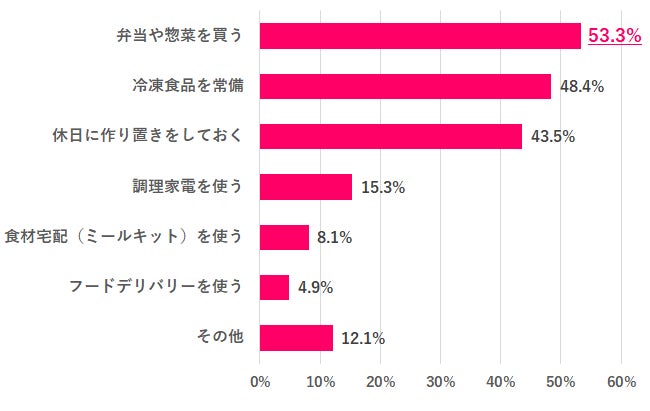 平日の晩ご飯の負担軽減策として「弁当や惣菜を買う」53.3%、「冷凍食品を常備」48.4%、「休日に作り置きをしておく」43.5%が上位でした。