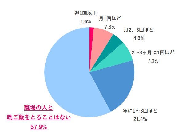 仕事終わりに職場の人と晩ご飯に行くことはあるかを聞いたところ、最も多かったのは「職場の人と晩ご飯をとることはない」で、57.9%と過半数を占めていました。次いで多かったのも「年1~3回ほど」21.4%であり、職場の人と仕事終わりにご飯に行く人は非常に少ないことがわかります。