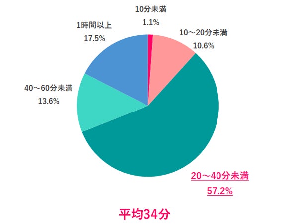 続いて平日の晩ご飯にかける時間を尋ねたところ、「20~40分未満」が57.2%と過半数を占め、平均34分でした。「1時間以上」と答えたのは17.5%と2割に満たず、平日の晩ご飯をゆっくり楽しむ人は少数派であることがわかります。