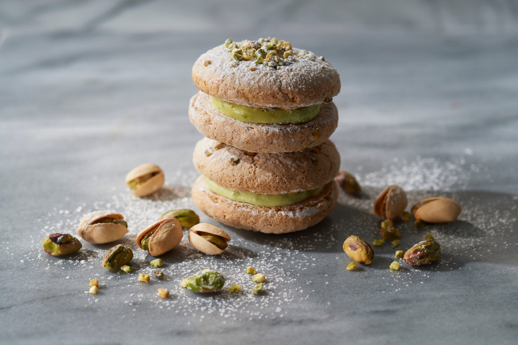 ピスタチオ薫る濃厚なクリームを柔らかく香ばしい食感のブッセ生地でサンドしました。ピスタチオの芳醇な香りを贅沢に味わえるサンドケーキです。