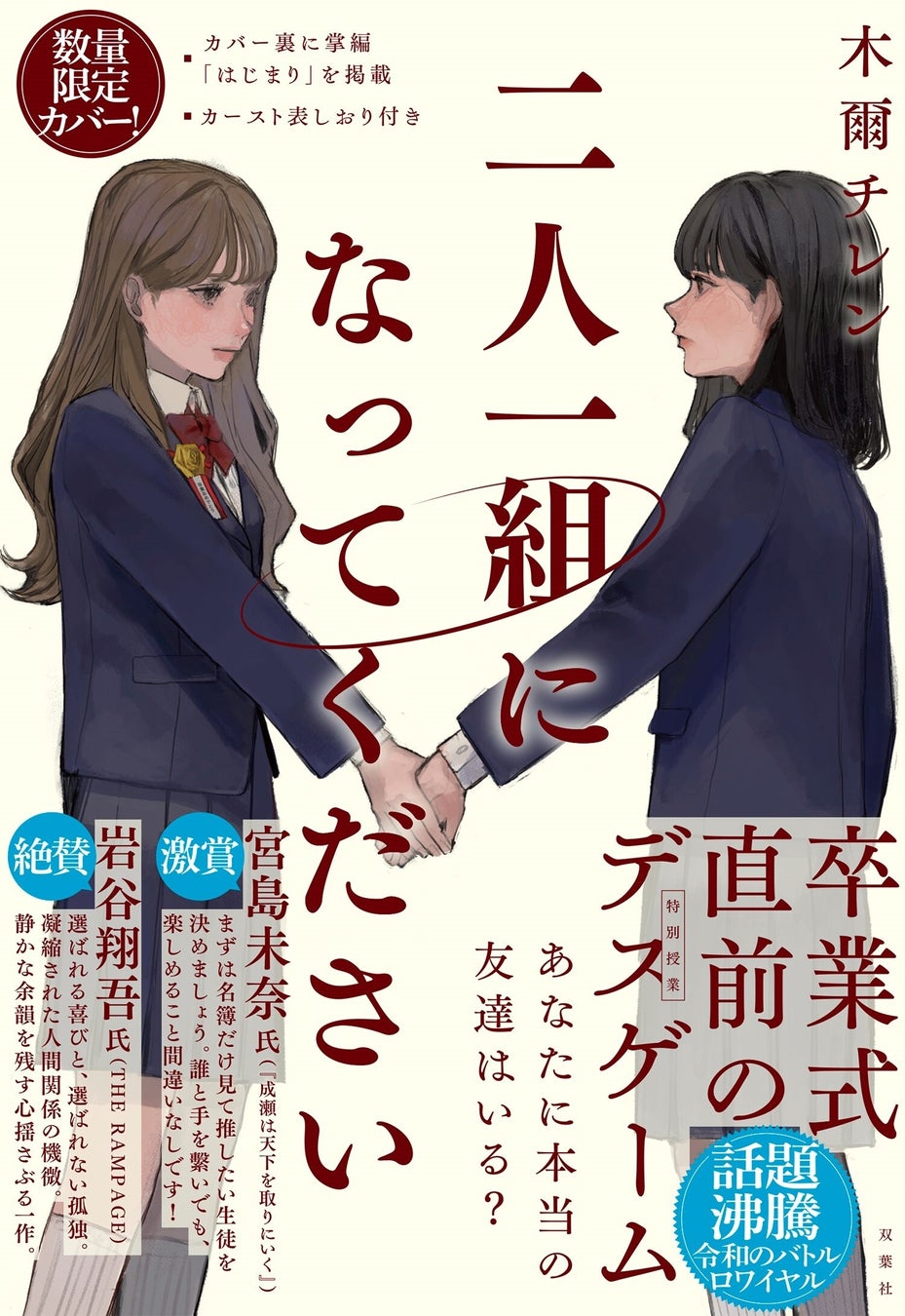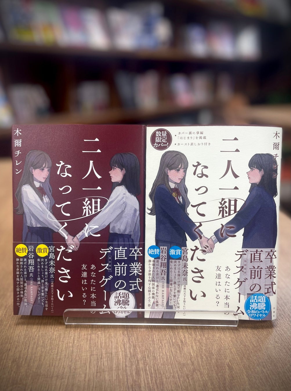 9月に弊社より刊行された木爾チレン(きな・ちれん)氏の『二人一組になってください』が続々と重版を重ね、6万部を突破しました。本作は女子高の卒業式直前のデスゲーム小説。友情とスクールカースト、無自覚の悪意によるいじめをテーマにした「令和のバトルロワイヤル」は今年最大の注目作です。卒業シーズンを控えたこの冬、新しいカバーで書店店頭に並びます。人気イラストレーターのyudouhuさんが新たに書き下ろしたイラストはブレザーを着た冬仕様。背景も白地となり、オリジナルの赤バージョンと並べるとクリスマスカラーに。12月12日出来の重版分から全国の書店さんに出荷されます。