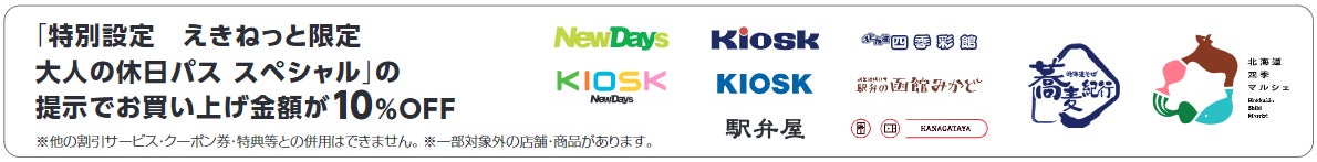 「特別設定 えきねっと限定 大人の休日パス スペシャル」のきっぷをご提示いただくと、ジェイアールバス東北の一般乗合バス対象路線が普通運賃より10%割引の会員価格でご乗車でき、NewDays等のエキナカでのお買いものが10%割引になるなど、様々な特典や割引サービスをご用意しています。