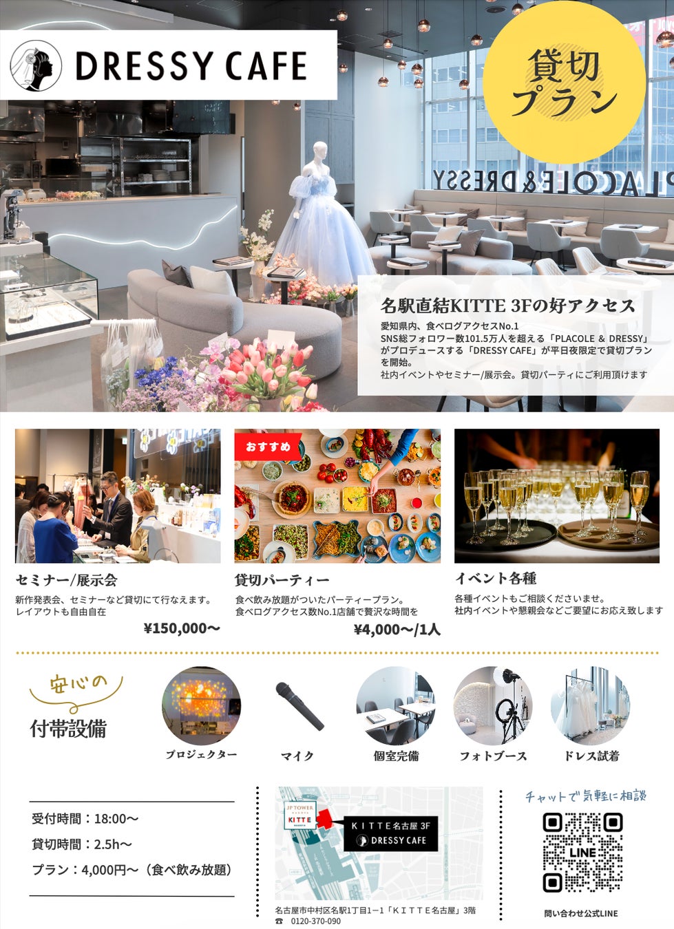 〒450-0002 ※JR名古屋駅から徒歩1分 名古屋駅は東海道新幹線をはじめJR・名鉄・近鉄・市営地下鉄・バスが乗り入れる総合ターミナルです。 URL:https://dressycafe-nagoya.pla-cole.wedding/ [SNS] |