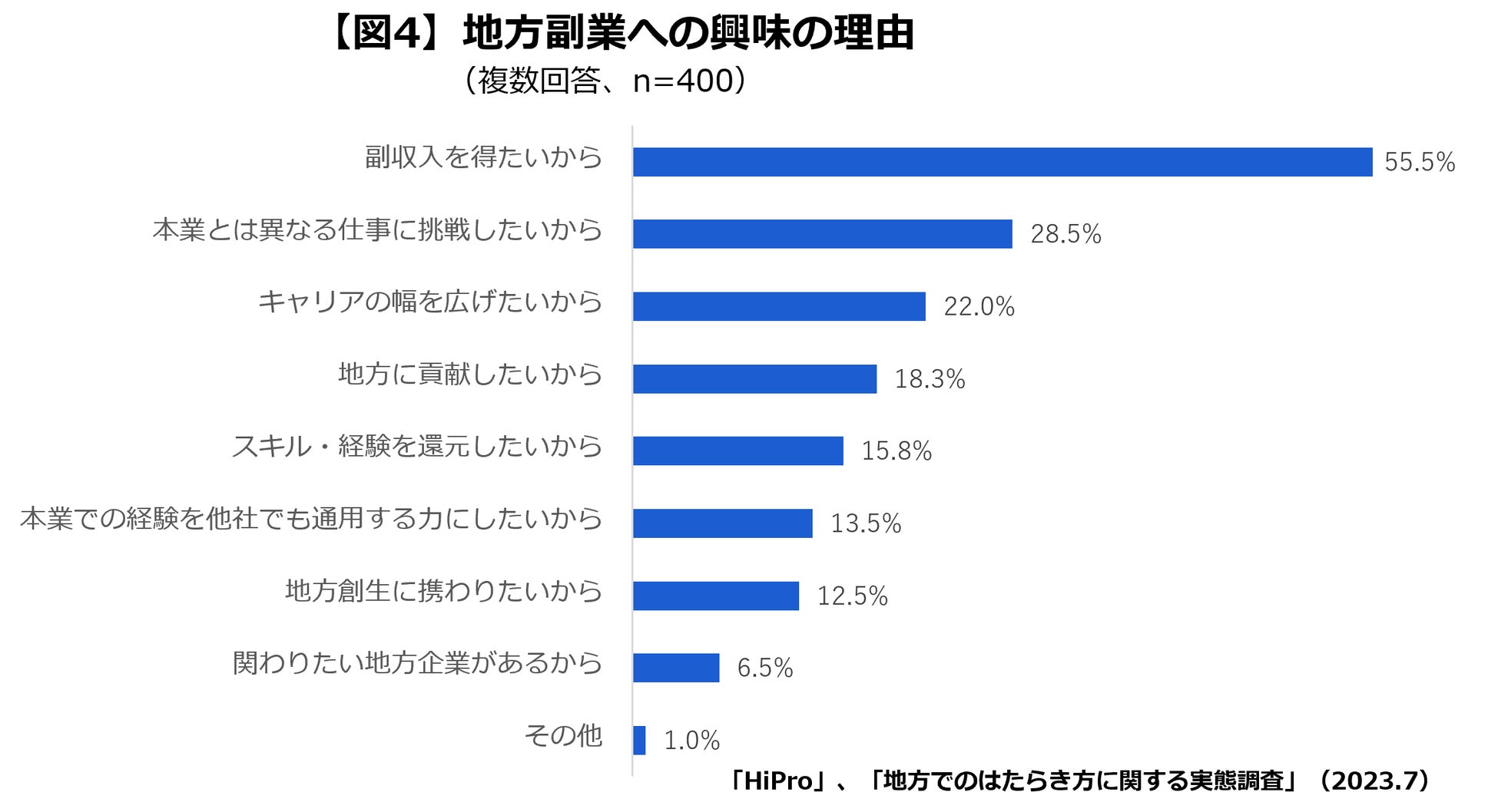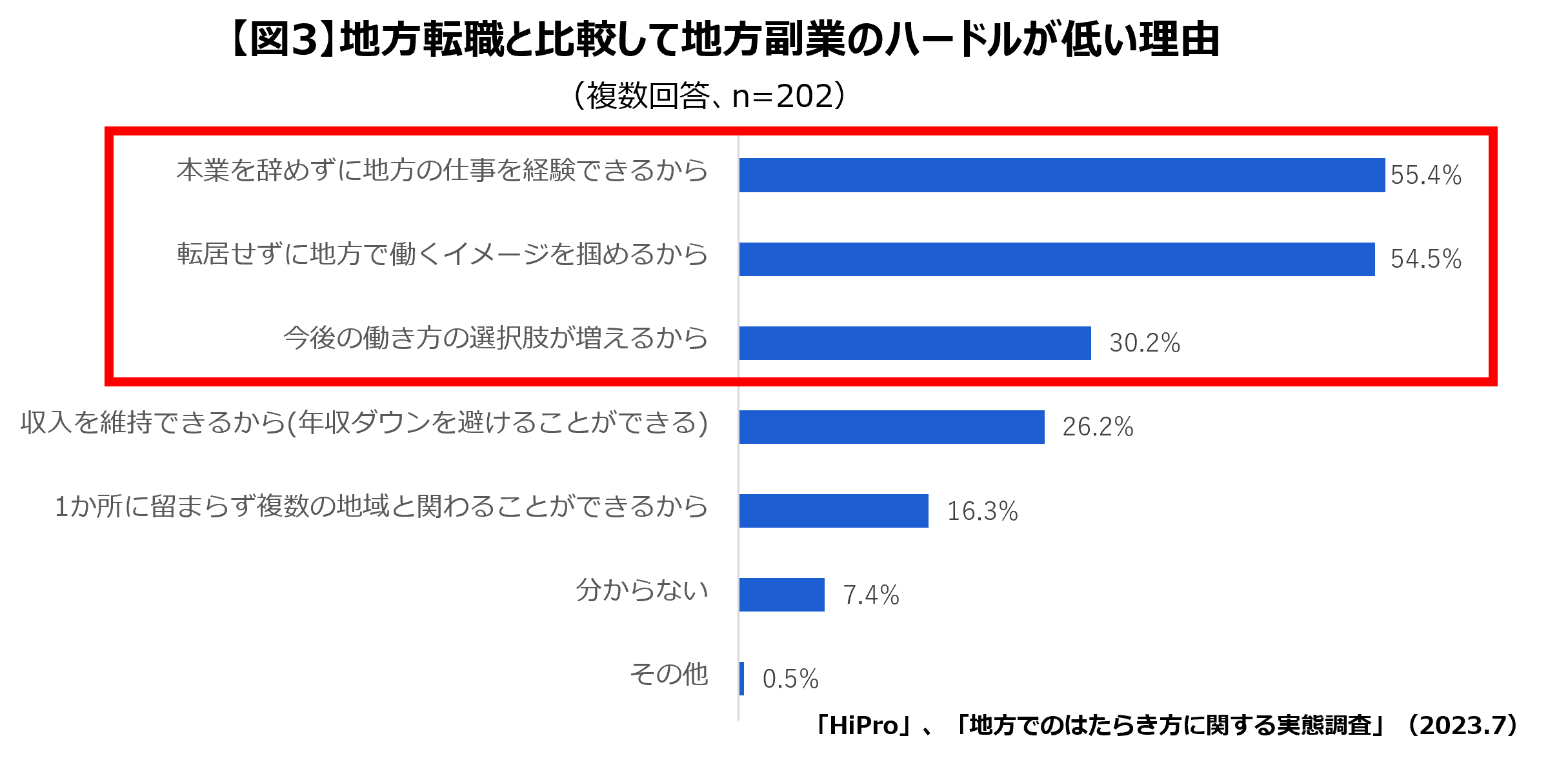 また、その理由として「本業を辞めずに地方の仕事を経験できる(55.4%)」「転居せずに地方で働くイメージを掴める(54.5%)」「今後のはたらき方の選択肢が増える(30.2%)」が上位に挙がりました。このことから、地方副業は居住地や現職といった現状を変えることなく、地方に関わるといった新たなはたらき方が実現できるため、ハードルを感じづらいと言えるでしょう。(【図3】参照)