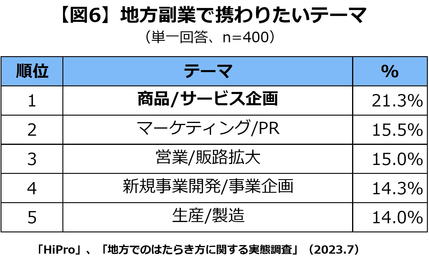 また、「地方副業で携わりたいテーマ」としては、「商品/サービス企画(21.3%)」「マーケティング/PR(15.5%)」「営業/販路拡大(15.0%)」が上位に挙がり、ビジネス領域におけるテーマで地方に携わりたいと考える人が多いことも判明しました。(【図5】【図6】参照)