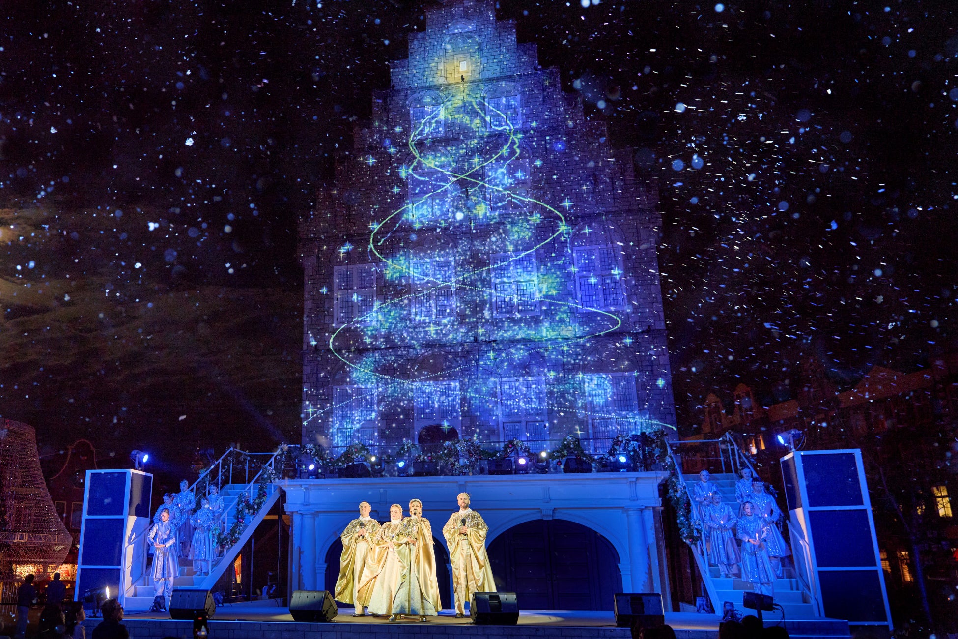 日が沈み、空気がぐっと冷え込む頃、神聖なチャペル『スタッドハウス』を舞台に、力強い歌声と無数の輝きが圧巻のナイトショー『メロディー・オブ・クリスマス』がスタートしました。 ショーに登場する聖歌隊360度クリスマスオーナメントで埋め尽くされる『クリスマススクエア』には、荘厳なコーラスが響き渡り、ゲストは、聖歌隊の歌声に魅了されていました。誰もが息をのむ中、まるで本物の雪が舞い降りたかのような演出が始まり、ゲストたちは思わず空を見上げ、手を伸ばし、会場全体が幻想的な雰囲気に包まれていきました。