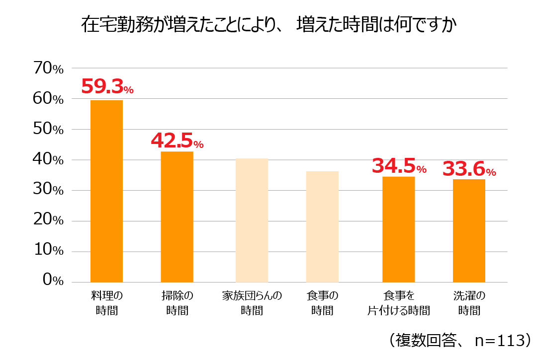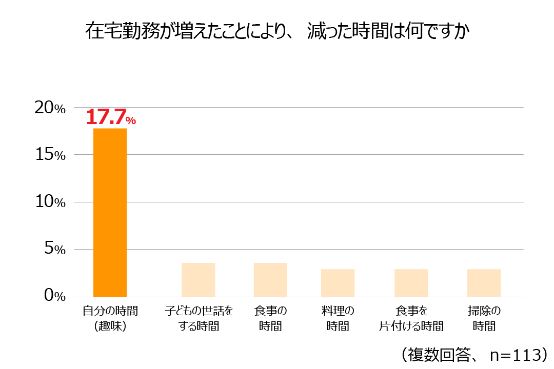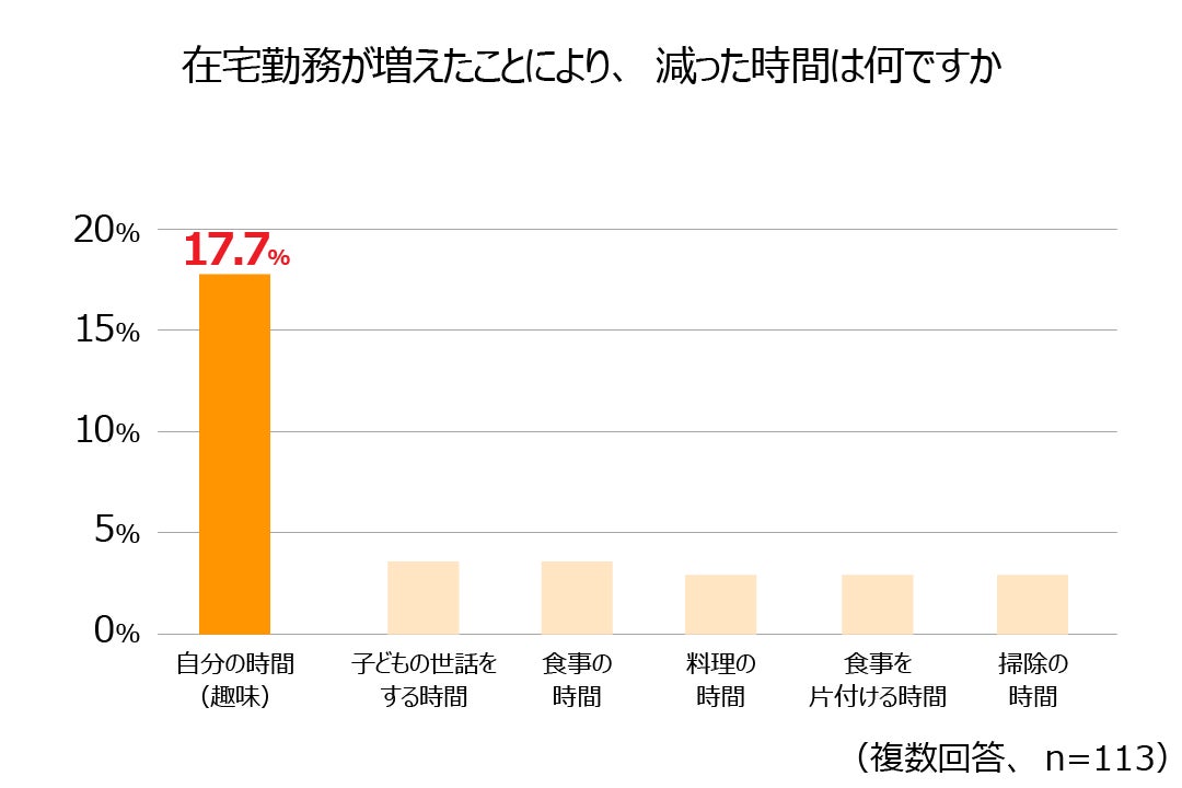 在宅勤務が増えたことにより、「料理」「掃除」など、いわゆる「家事」にかかる時間が増加した一方で、17.7%が「自分の時間(趣味)が減った」と感じています。