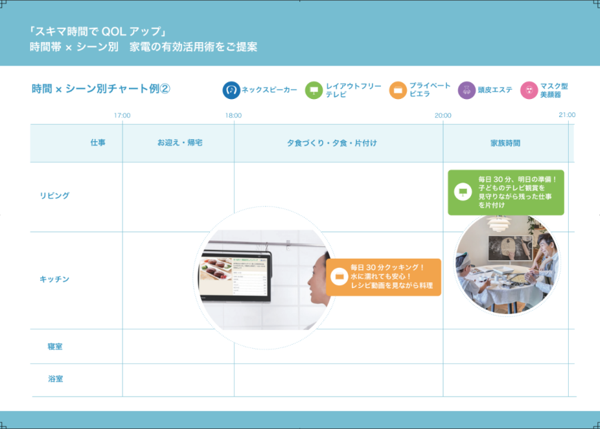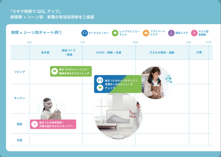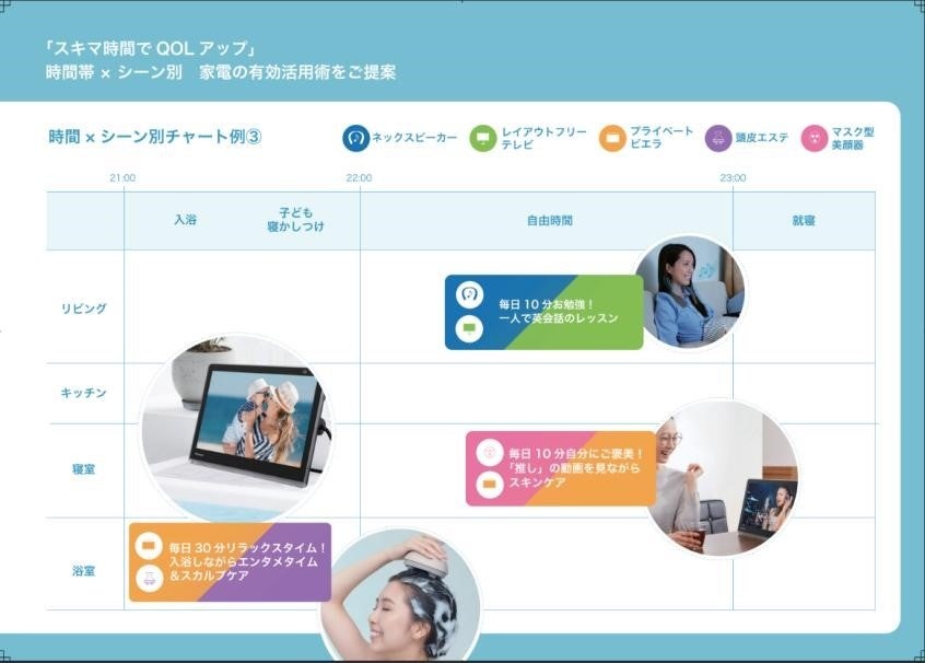 そこで、スキマ時間・ながら時間を使って、効率よく自分磨きができる家電の活用術を、シーン・時間帯別にご紹介します。「レイアウトフリーテレビ」「プライベート・ビエラ」「ネックスピーカー」「マスク型イオン美顔器」「頭皮エステ」を使って、1日の少しの時間でQOLアップを目指しませんか?