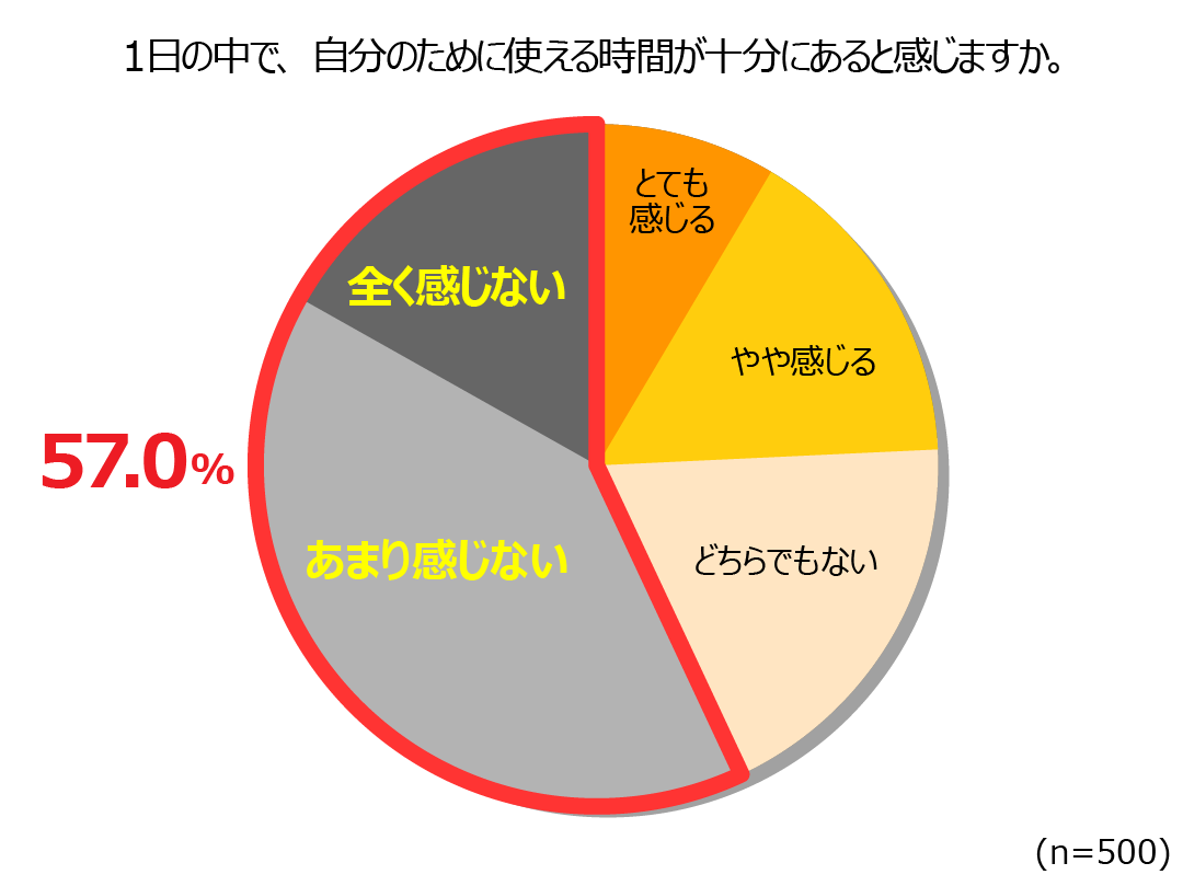 また、57.0%が「1日の中で、自分のために使える時間が不十分」と感じていることが判明しました。