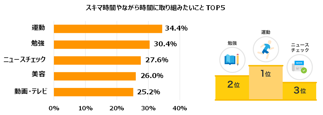 ●スキマ時間・ながら時間に取り組みたいことTOP3は「運動」「勉強」「ニュースチェック」。