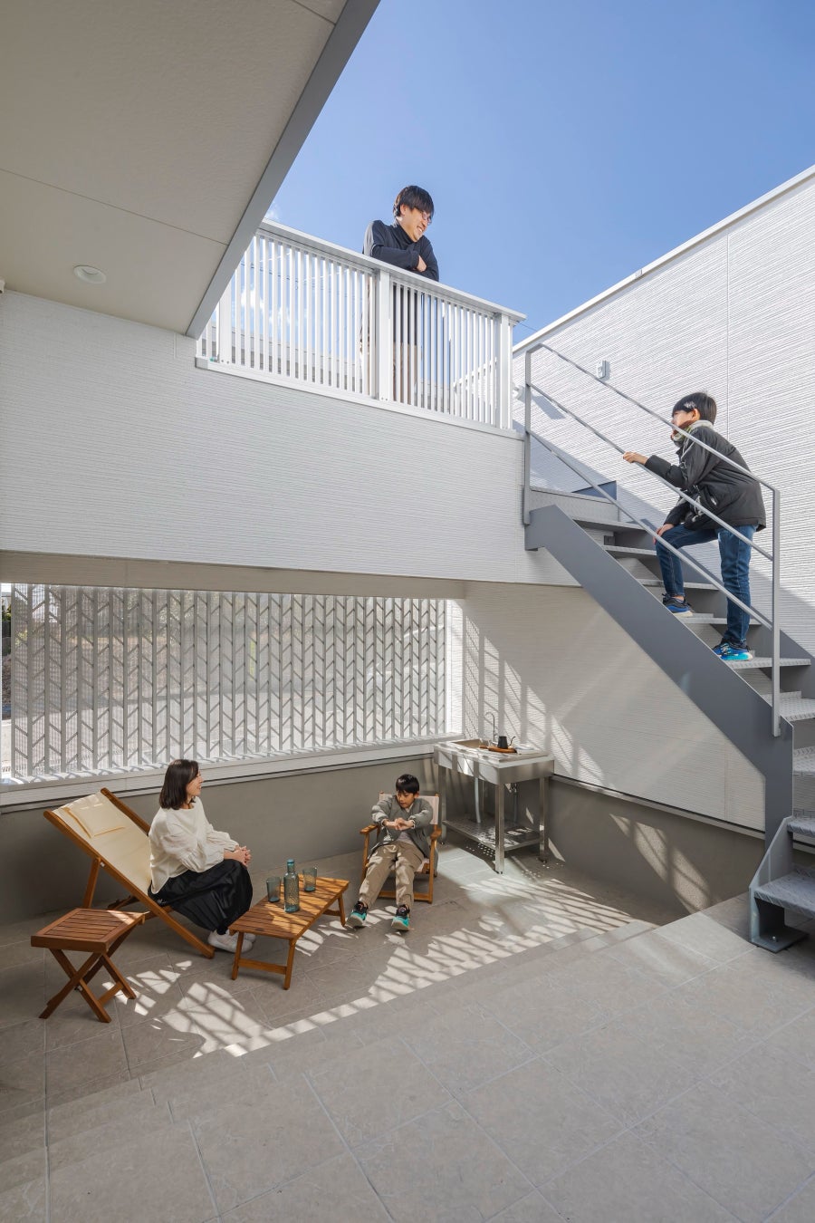 1. ランドスケープによって起こる空間の変化や抑揚が連続するリビングを中心とした内外をタテにつなぐ居場所。