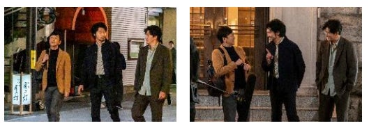 夜には外へ移動し商店街へ。真冬の夜と寒い中での撮影で、カイロを手に持ち暖を取る姿も見られましたが、笑顔を見せながら自然に明るい雰囲気で演じる3人。「もう1軒行く?」「いいっすね」「ラーメンとか?」と軽快に交わされる会話のシーンは、まるで3人の実際の打ち上げをのぞき見しているかのようでした。