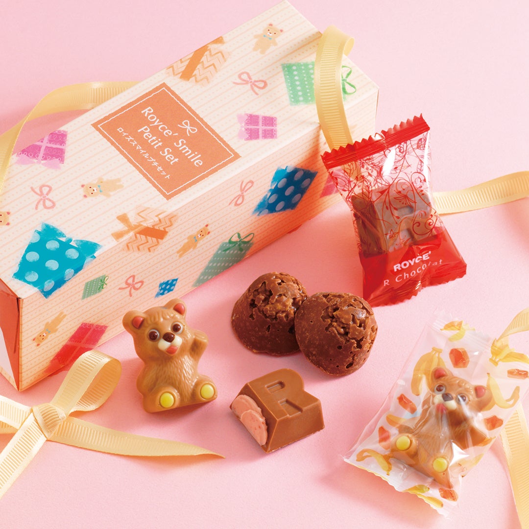 プチベアショコラ[キャラメルバナナ]とロイズアールショコラ[ストロベリー]、ポテチクランチチョコレートの詰め合わせです。気軽にチョコっと贈るプレゼントにおすすめのセットです。