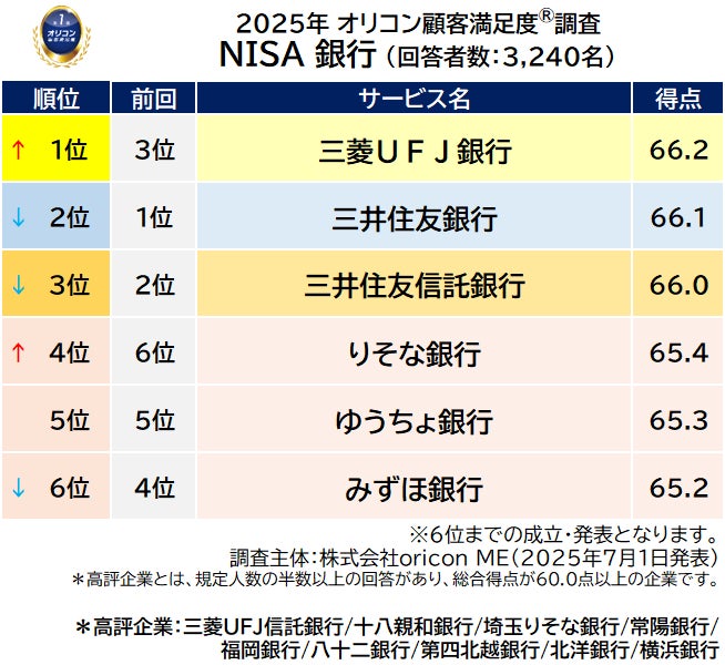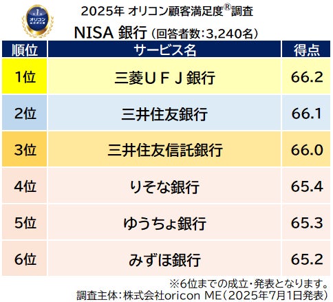 オリコン株式会社(本社:東京都港区 代表取締役社長:小池 恒、略称:オリコン)は、グループ会社である株式会社oricon MEが、実際のサービス利用者を対象に第三者の立場で実施した『NISA 証券会社/銀行』の顧客満足度調査の結果を、2025年7月1日(火)14時に「オリコン顧客満足度®」公式サイト内にて発表いたしました。ランキングの結果は下記の通りとなりました。