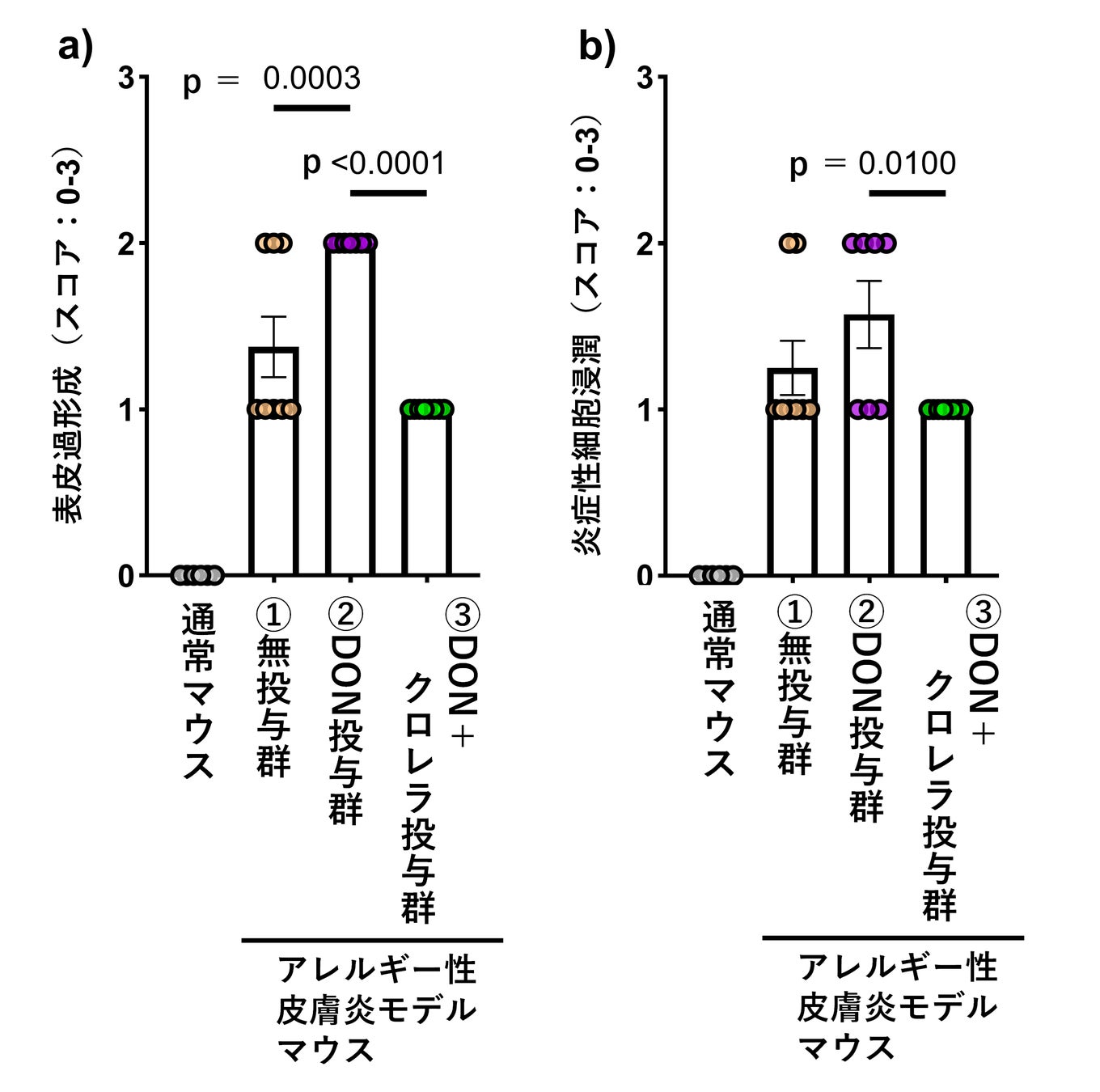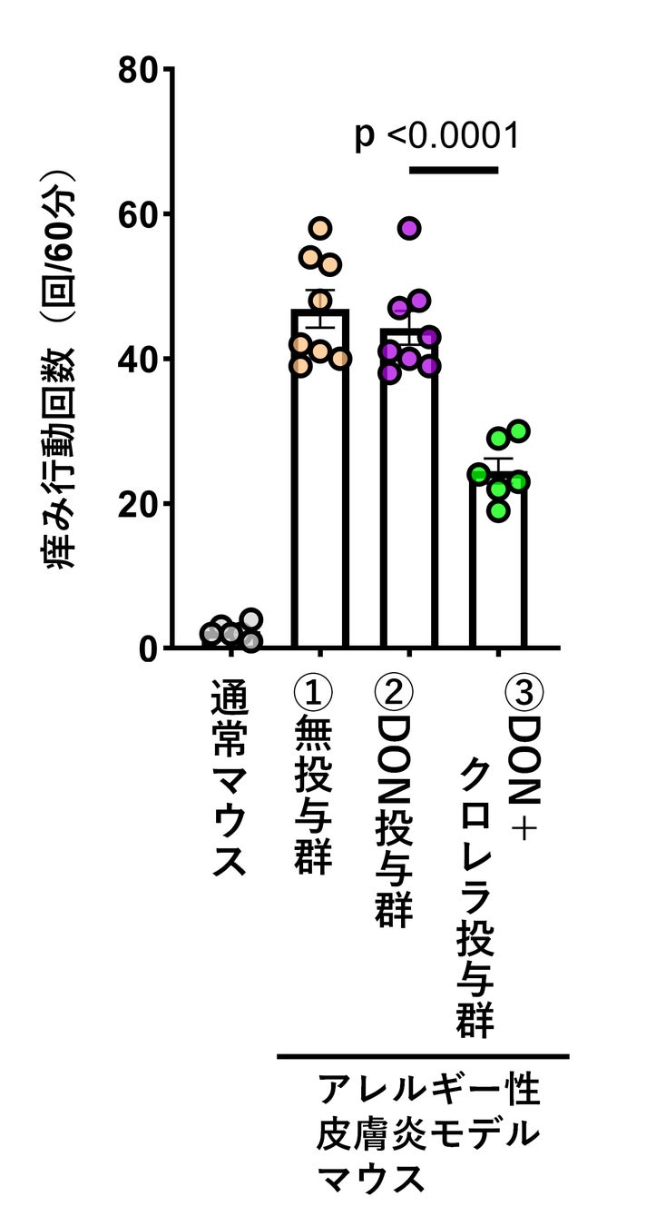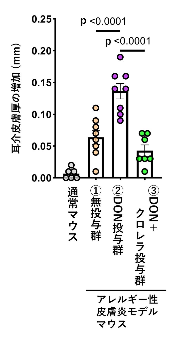 ヤエヤマクロレラの摂取が、マイコトキシンの一種であるデオキシニバレノールにより増悪する皮膚アレルギー症状を軽減する可能性を示す研究結果を確認