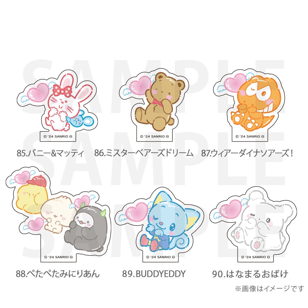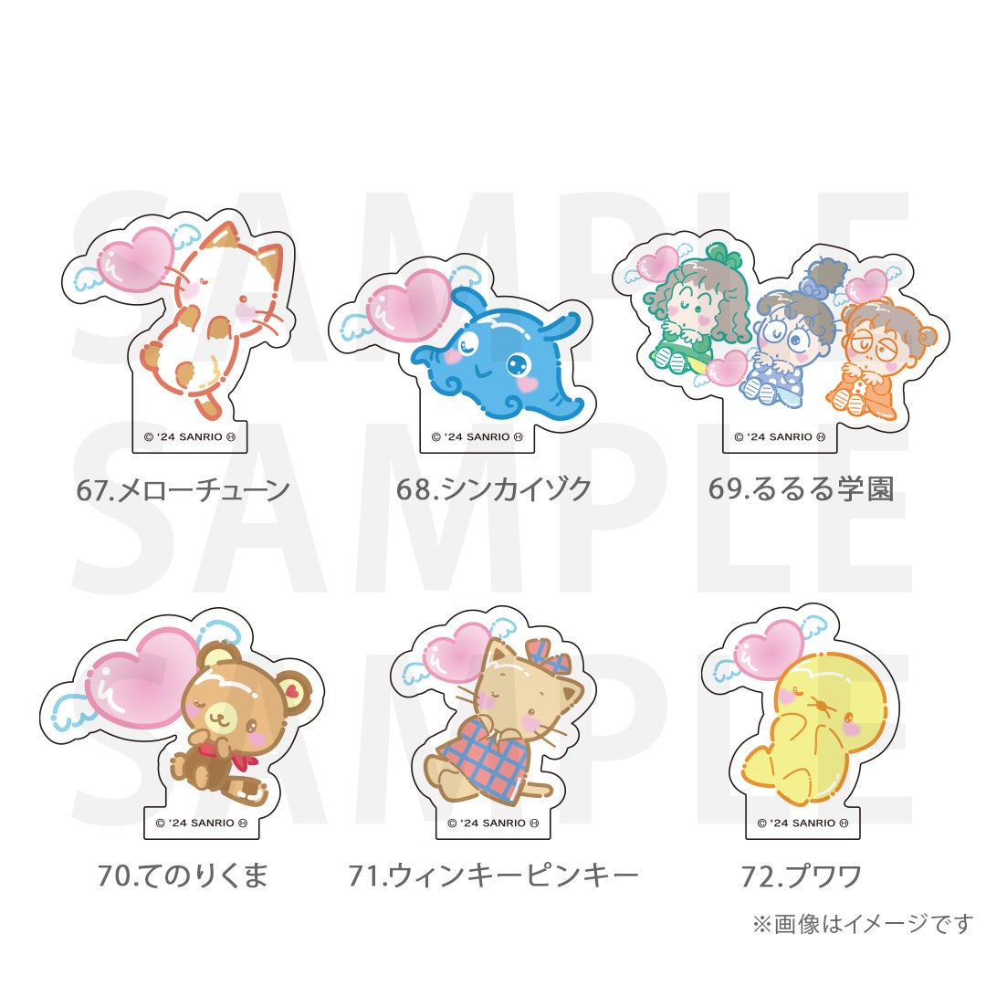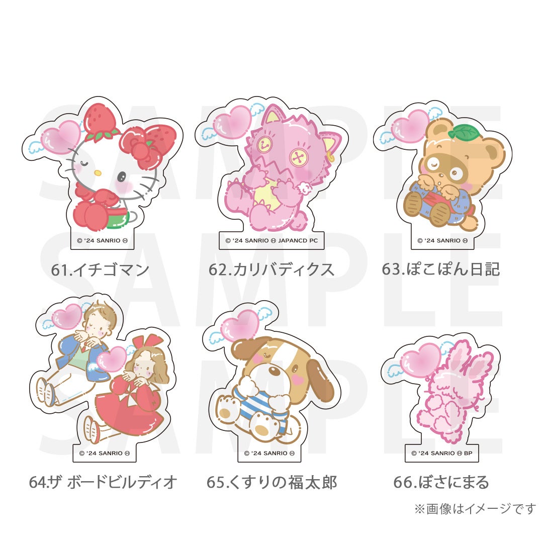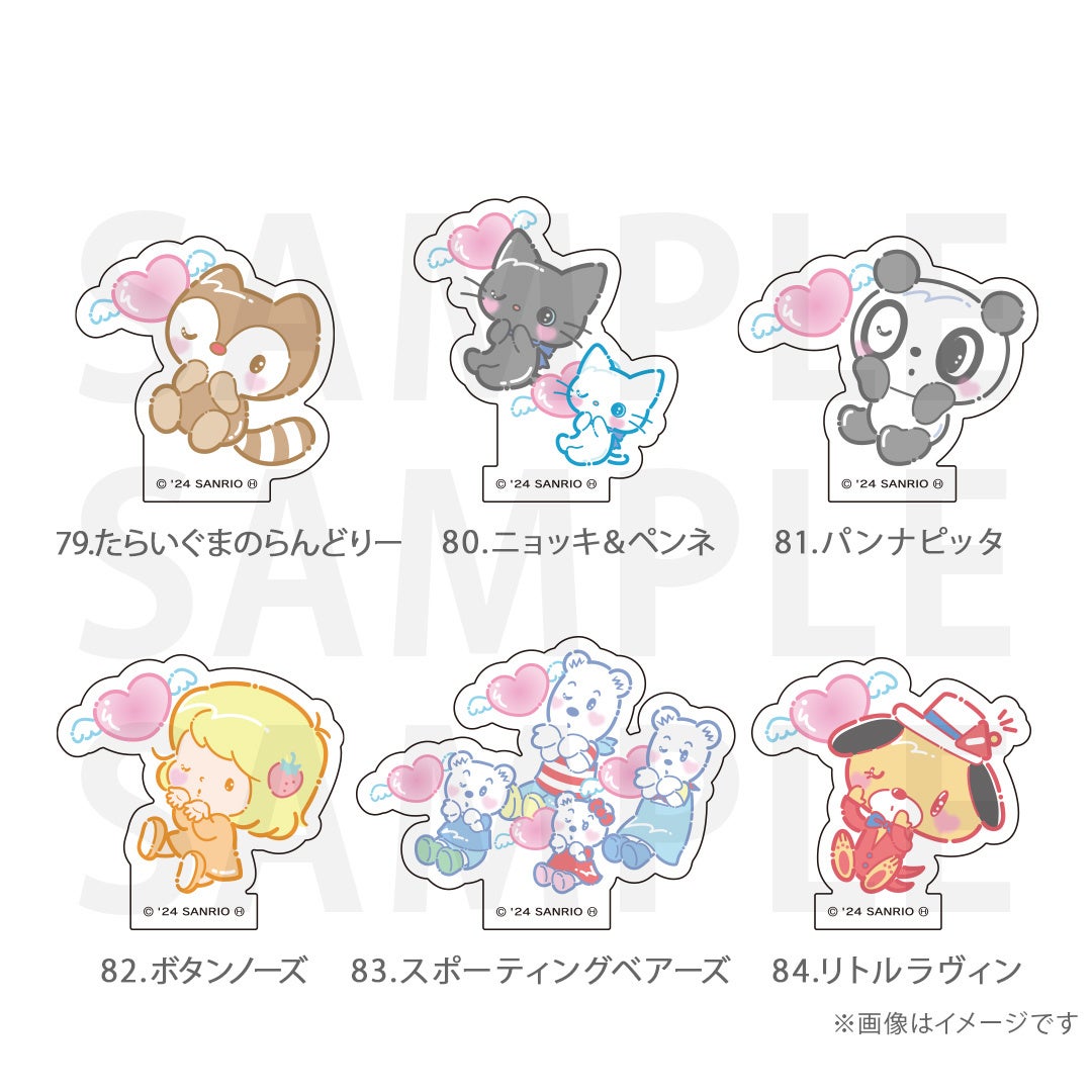 シナモロール、ポムポムプリン、クロミ、ポチャッコ、ハローキティ、マイメロディ、ハンギョドン、リトルツインスターズ、タキシードサム、バッドばつ丸、こぎみゅん、けろけろけろっぴ、ぐでたま、ウィッシュミーメル、あひるのペックル、KIRIMIちゃん.、マイスウィートピアノ、SHOW BY ROCK‼、コロコロクリリン、yoshikitty、まるもふびより、ウサハナ、がおぱわるぅ、かぶきにゃんたろう、マロンクリーム、みんなのたあ坊、ルロロマニック、ディアダニエル、チャーミーキティ、ハローミミィ、ジュエルペット、シュガーバニーズ、まいまいまいごえん、ニャニィニュニェニョン、ゴロピカドン、アグレッシブ烈子、おさるのもんきち、ぼんぼんりぼん、リトルフォレストフェロォ、パティ&ジミー、チアリーチャム、ぽっきょくてん、タイニーチャム、歯ぐるまんスタイル、ミュークルドリーミー、パタパタペッピー、ビートキャッツ、マシュマロみたいなふわふわにゃんこ、パウピポ、ザシキブタ、アドローザトルマリィ、ウメ屋雑貨店、フレッシュパンチ、リルリルフェアリル、チョコキャット、かしわんこもち、ぱんくんち、いちごの王さま、ノラネコランド、ハミングミント、イチゴマン、カリバディクス、ぽこぽん日記、ザ ボードビルディオ、くすりの福太郎、ぼさにまる、メローチューン、シンカイゾク、るるる学園、てのりくま、ウィンキーピンキー、プワワ、クマミレン、シュガーメヌエット、ザラナバウツ、リスル、セブンシリードワーフ、タイニーポエム、たらいぐまのらんどりー、ニョッキ&ペンネ、パンナピッタ、ボタンノーズ、スポーティングベアーズ、リトルラヴィン、バニー&マッティ、ミスターベアーズドリーム、ウィアーダイナソアーズ!、ぺたぺたみにりあん、BUDDYEDDY、はなまるおばけ